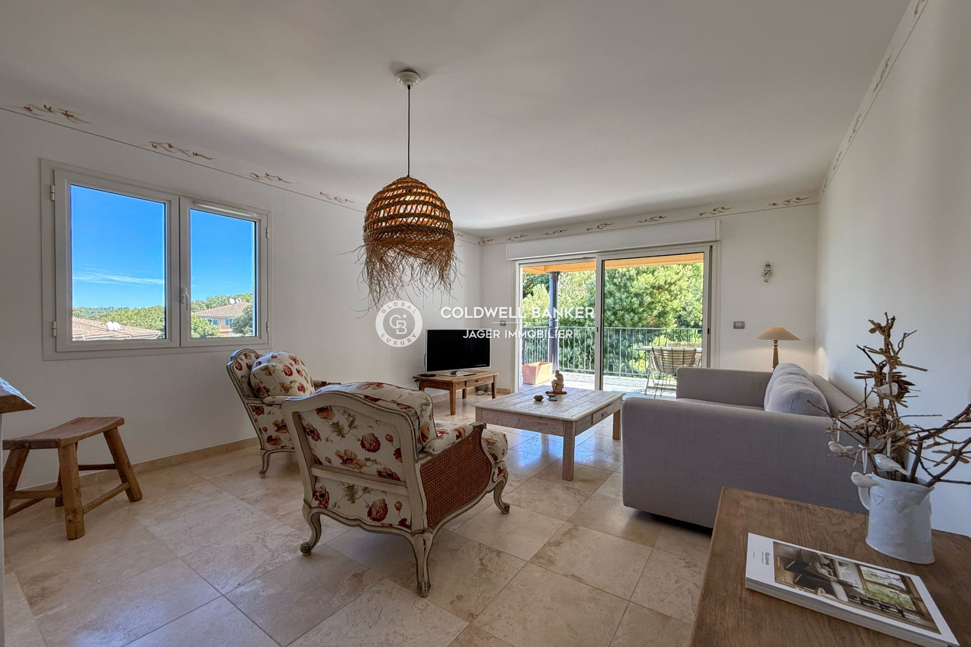 Un hall d’entrée avec placard mène vers une pièce de vie lumineuse, composée d’un salon et d’un coin cuisine ouvert dans une ambiance chaleureuse. Cet espace s’ouvre sur une belle terrasse couverte, exposée sud-est, sans vis-à-vis, offrant une agréable vue sur la verdure et une perspective dégagée vers l’Est et le village de Gassin