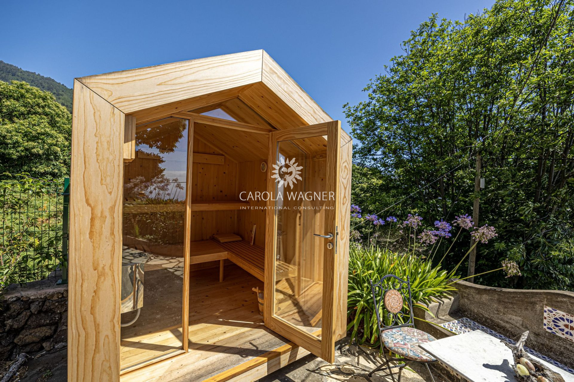 – Sauna en bois, fait sur mesure avec douche extérieure