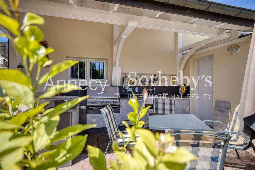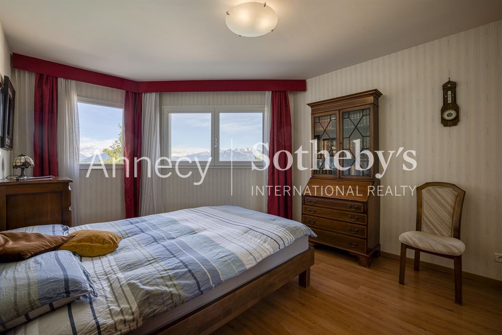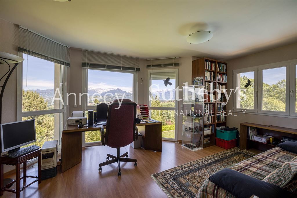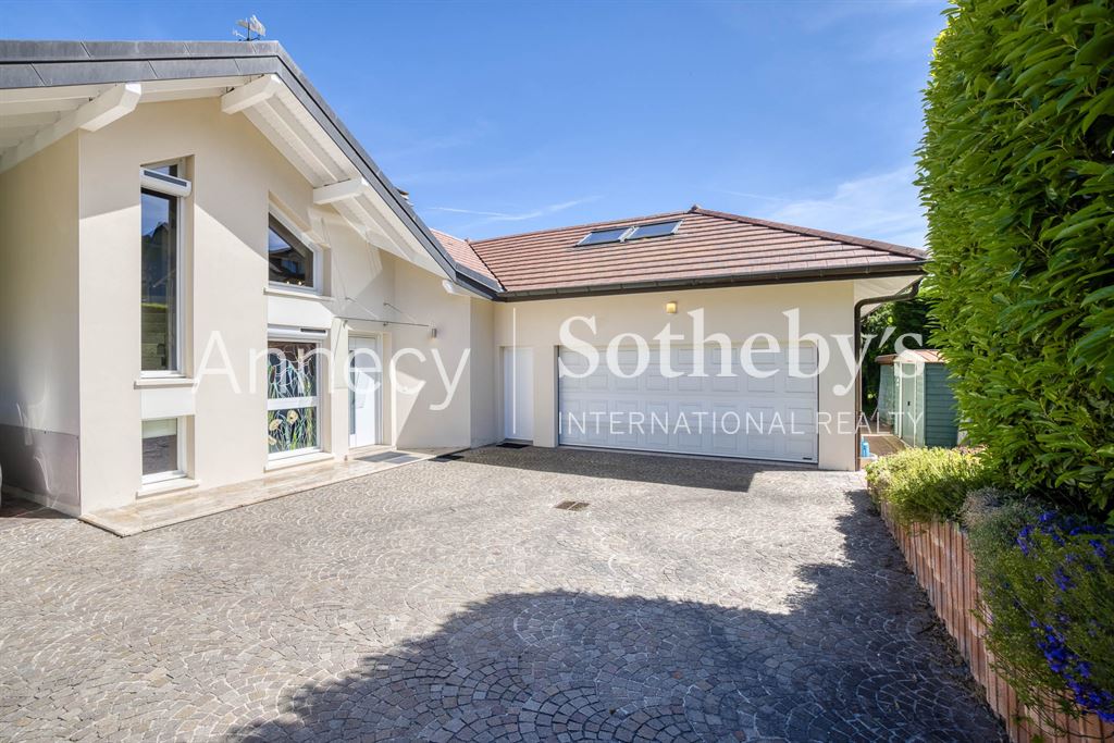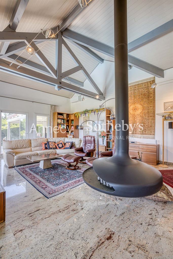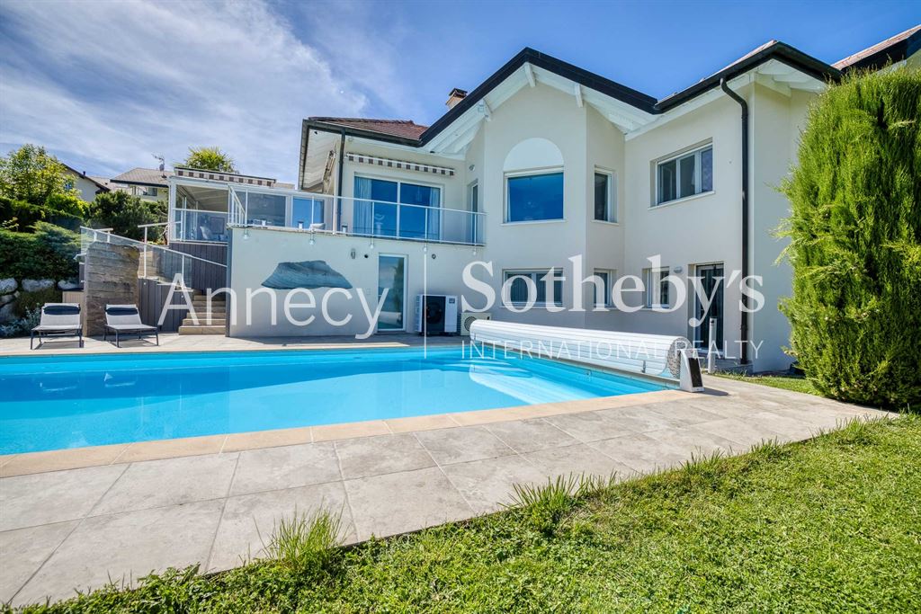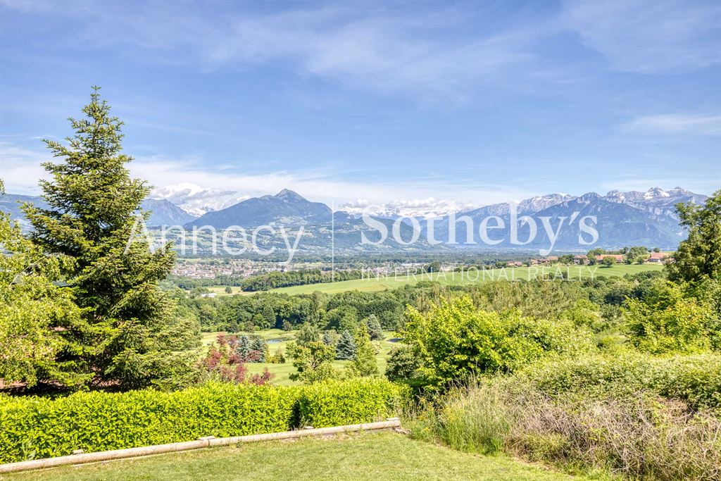 ANNECY SOTHEBY’S INTERNATIONAL REALTY vous propose cette superbe maison d’architecte de 263 m² (218 m² en loi Carrez) avec piscine, idéalement située à Reignier-Ésery, à proximité immédiate du golf,à 15 km de Genève sur un magnifique terrain paysager de 1 700 m² offrant une vue imprenable sur la chaîne du Mont-Blanc.