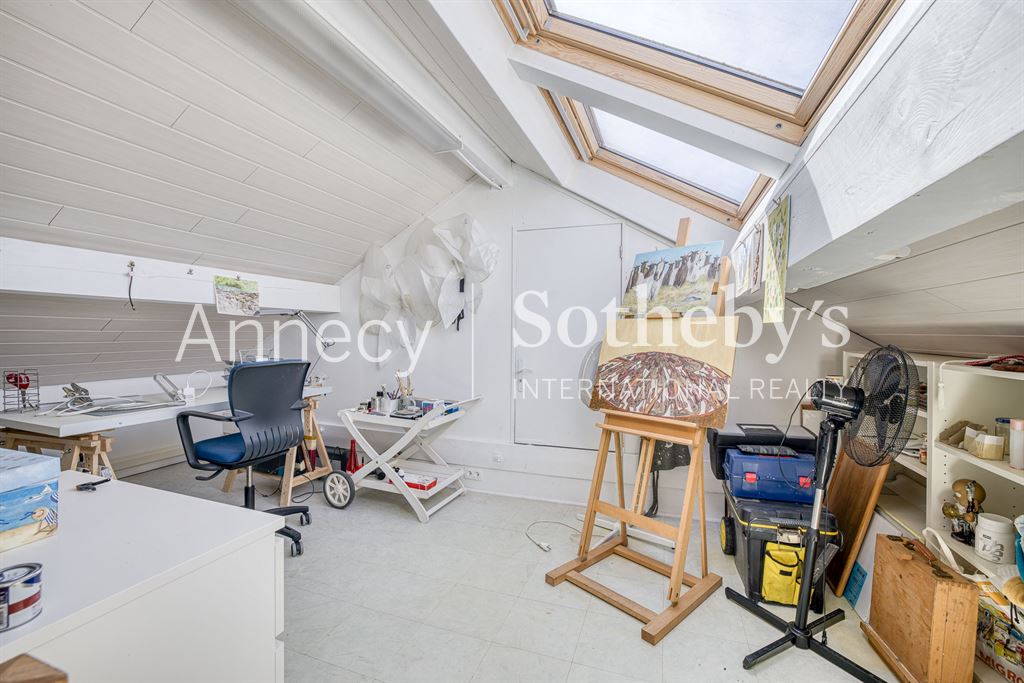 La propriété dispose également d’un garage double équipé d’une borne de recharge pour véhicule électrique, avec une mezzanine actuellement aménagée en atelier de peinture.