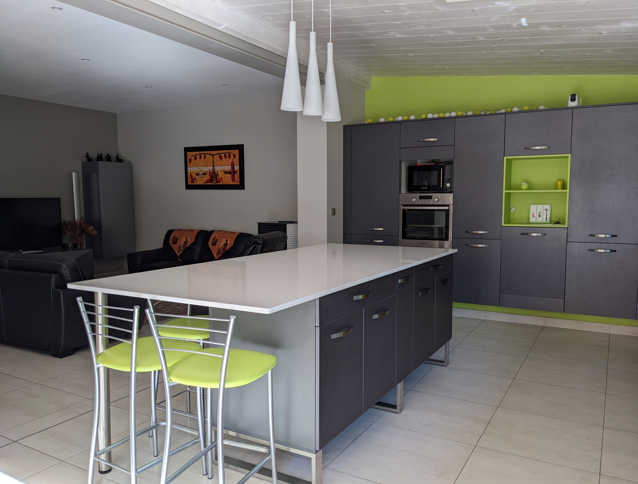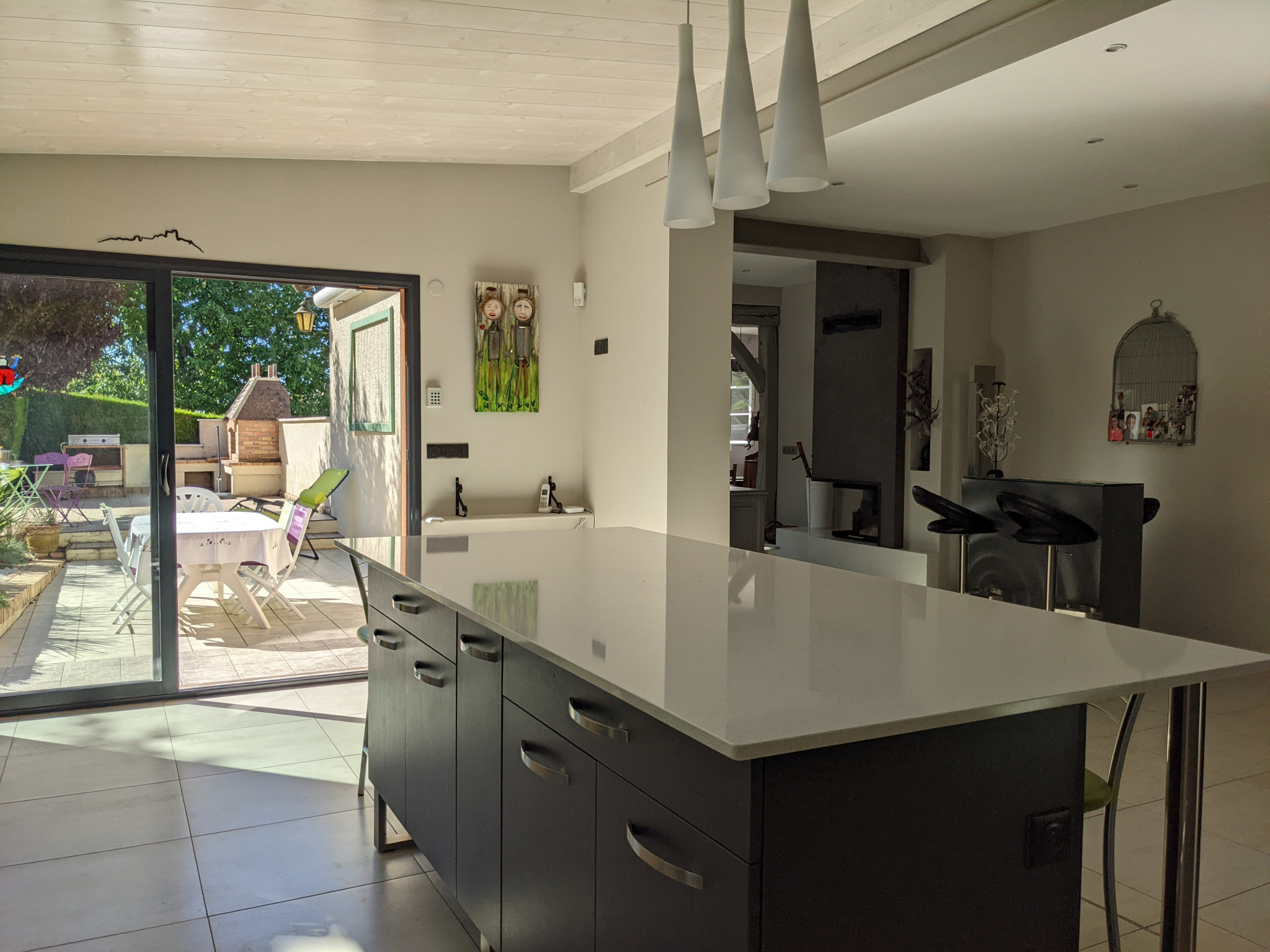 L’ensemble immobilier se compose d’un rez-de-chaussée surélevé avec une entrée desservant un salon avec cheminée, une vaste et lumineuse salle à manger ainsi qu’une spacieuse cuisine ouverte et aménagée avec son îlot central permettant un accès direct à la terrasse extérieur. Chambre parentale avec salle de d’eau privative. wc. Chauffage avec poêle à granules et électrique. A l’étage, découvrez trois chambres de belle superficie ainsi qu’une salle d’eau et wc.