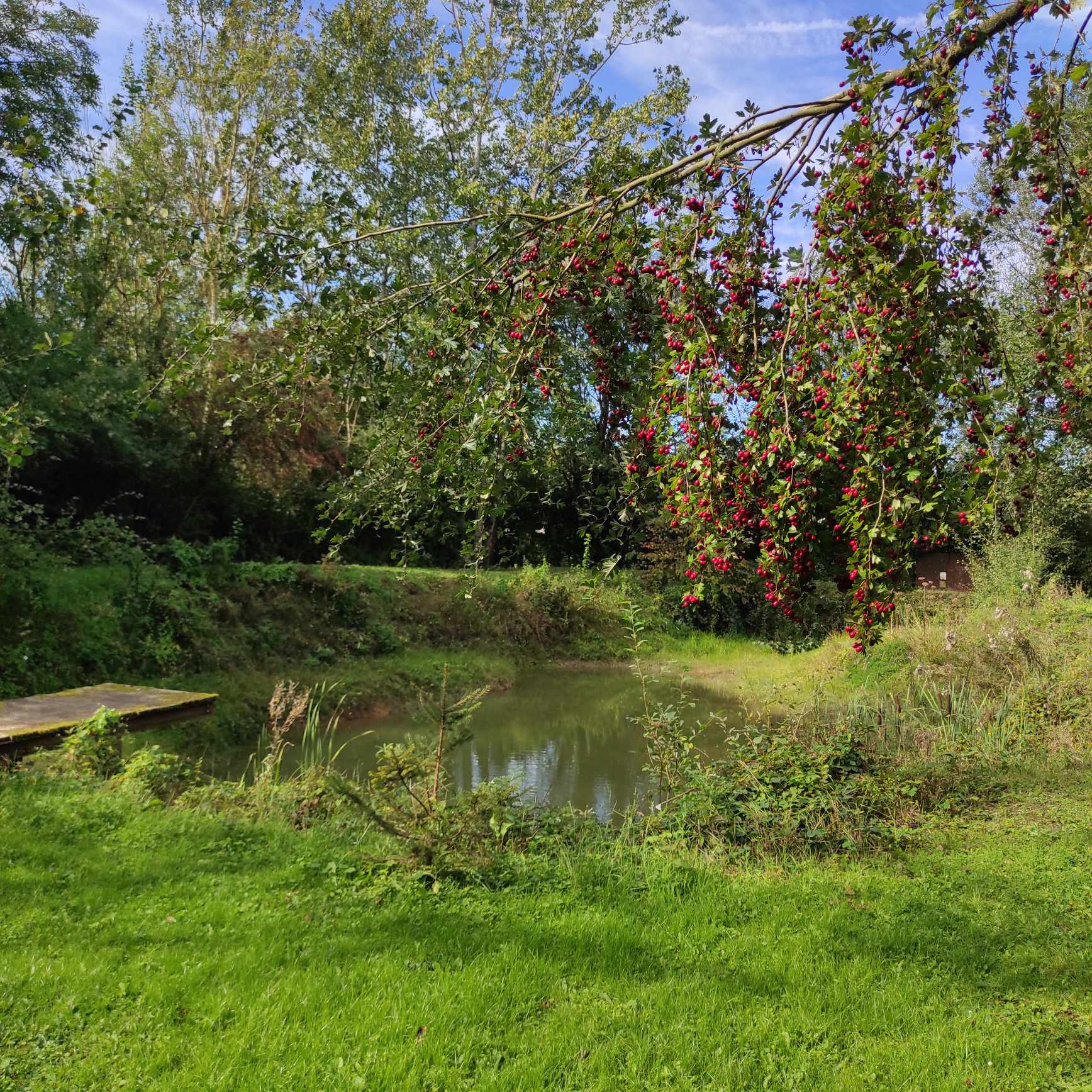 En effet, dans l’environnement de l’étang, un beau verger : pommier, poirier, cerisier, abricotier, pêché, noyer, ainsi que : cassissier, framboisier, mûrier, groseillier, fraisier et même une vigne + une grande serre et ses variétés de tomates anciennes.