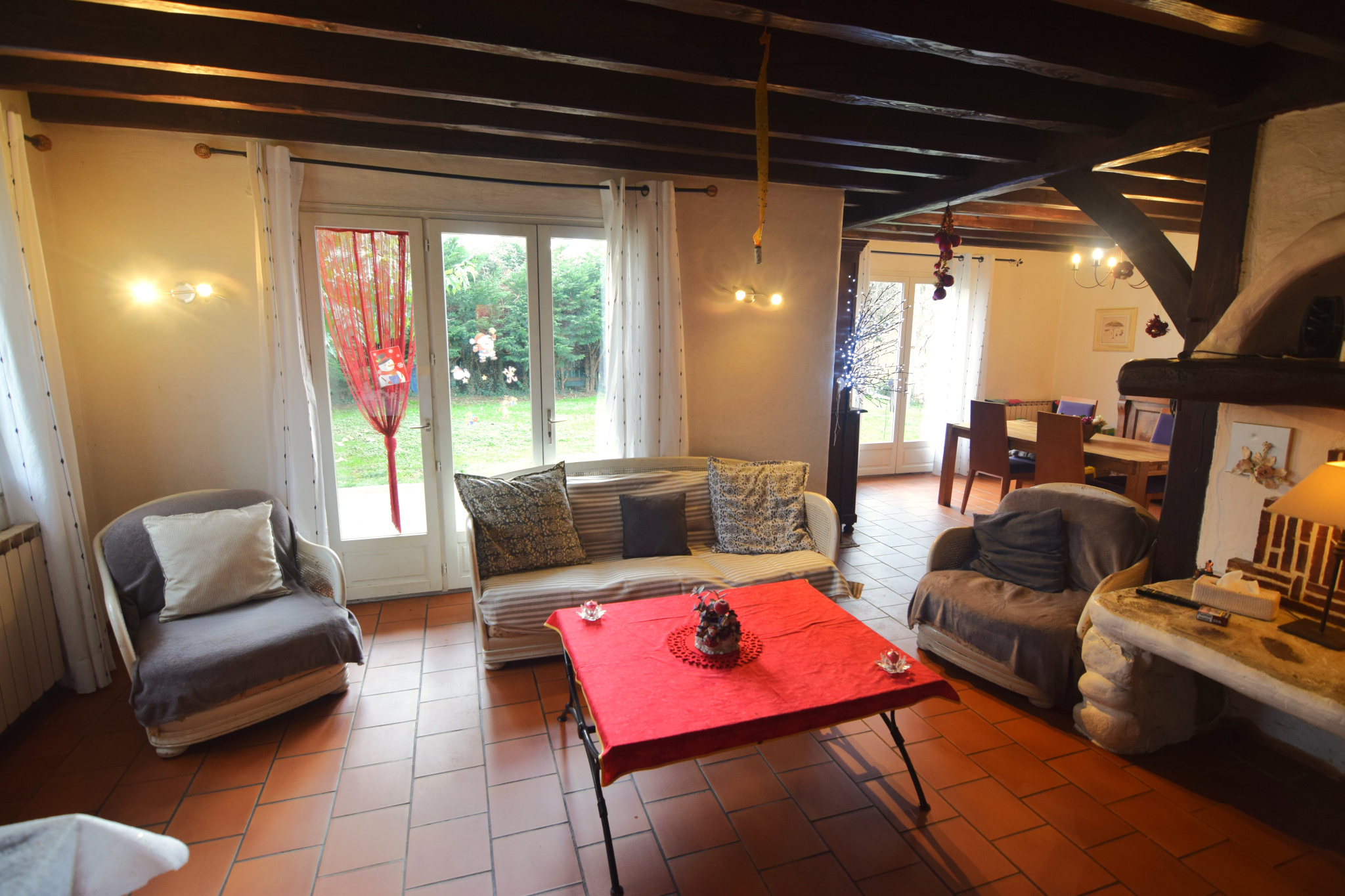 Entrée par un séjour/salle à manger et sa cheminée, une cuisine séparée, un couloir distribuant trois chambres dont une avec sa mezzanine et accès aux combles de la maison.