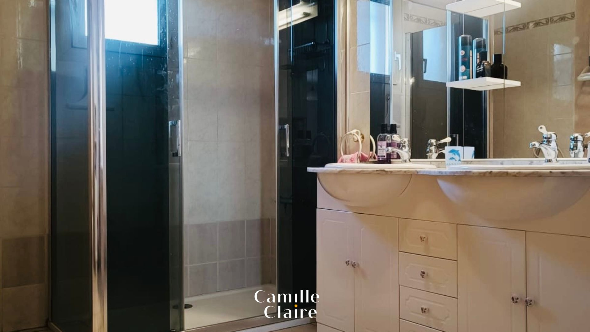 Il y a également 3 belles chambres, 1 grande salle d’eau ainsi que de nombreux rangements, menuiseries pvc double vitrage, volets battants en alu, climatisation réversible et chauffage gaz de ville.