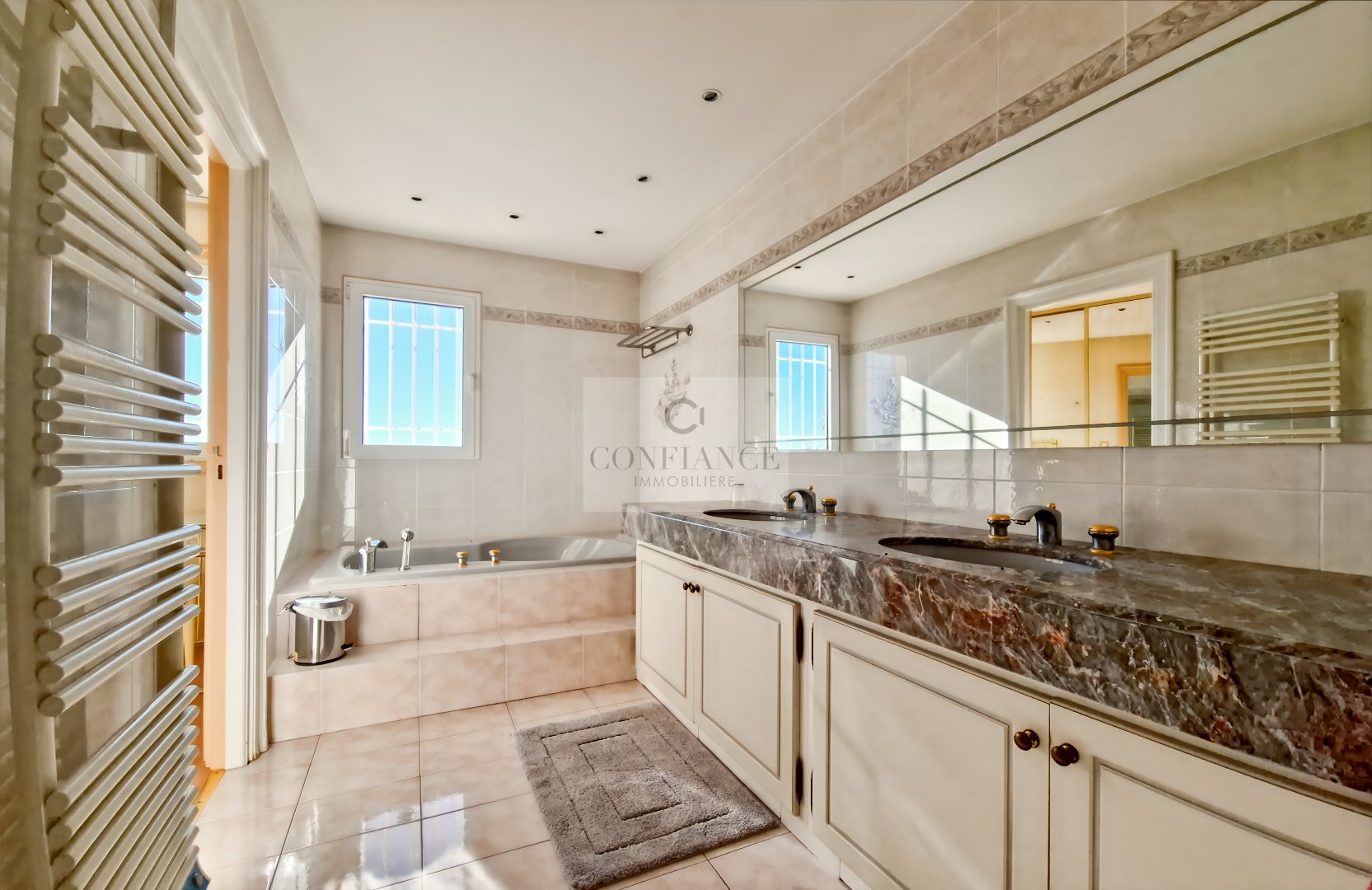 MANDELIEU LA NAPOULE Splendide villa de 285 m² offrant une vue imprenable sur le golfe de la Napoule et les iles de Lerins. Nichée dans un secteur calme et résidentiel à seulement 5 minutes du centre-ville, cette superbe villa de 285 m² bénéficie dune vue panoramique mer et sur la baie de Cannes. Son emplacement stratégique permet un accès rapide commerce, autoroute et transport. Exposée plein Sud, la propriété dispose dun vaste poolhouse, dune grande terrasse ainsi que dune piscine à débordement, créant un cadre extérieur parfait pour se détendre, tout en profitant de la vue exceptionnelle renforçant le caractère unique de cette villa. Le jardin paysager, orné de plantes méditerranéennes, vient compléter ce lieu de vie dexception. Répartition des espaces : Au rez-de-chaussée, vous trouverez une large entrée de 35 m² avec de nombreux placards de rangement. Laccès au garage spacieux de 80 m² vous permet de protéger vos véhicules. À ce niveau, une première chambre en suite, isolée, pourrait servir à loger du personnel ou des invités. Au premier étage, les espaces de vie sont baignés de lumière grâce à lorientation idéale de la villa. Le salon de 60 m², doté dune cheminée, souvre sur la terrasse, tout comme la salle à manger et la cuisine attenante de plus de 20 m², équipée dappareils électroménagers haut de gamme (Gaggenau, Siemens). La cuisine est idéalement située à proximité du barbecue extérieur pour vos repas en plein air autour de la piscine. Ce niveau est parfait pour organiser des moments conviviaux en famille ou entre amis. Vous y trouverez également une grande buanderie, une cave et une cave à vin. Au second niveau, deux chambres en suite de 14 et 18 m², chacune avec rangement et salle de bains (douche, baignoire et WC), souvrent sur une terrasse commune de 15 m². La suite parentale, quant à elle, mesure 23 m² et comprend un immense dressing de 13,8 m² ainsi quune salle de bains avec douche, baignoire et WC. Depuis toutes ces pièces, la vue panoramique est tout simplement spectaculaire. Des rangements supplémentaires sont aménagés dans le couloir menant aux chambres.Sur ce niveau toutes les fenêtes sont à galandage. La villa, de style provençal, a été construite sur une parcelle de 1500 m², directement sur la roche, en 1995. Équipements techniques : Ascenseur desservant les trois niveaux / Fenêtres à triple vitrage Volets roulants électriques / Vide sanitaire / Système d’alarme et interphone avec vidéo 4 places de stationnements extérieures avec abri Local technique et cave à vin / Climatiseur réversible récent dans toutes pièces. Un rafraîchissement permettra de révéler tout le potentiel de cette splendide villa. Les informations sur les risques auxquels ce bien est exposé sont disponibles sur le site Géorisques http://www.georisques.gouv.fr Toute l’équipe Confiance Immobilière vous remercie. Taxe F …. – Carrez 284.64m² / Hab 308.79 m² – Dpe C /A Honoraires à la charge du vendeur.