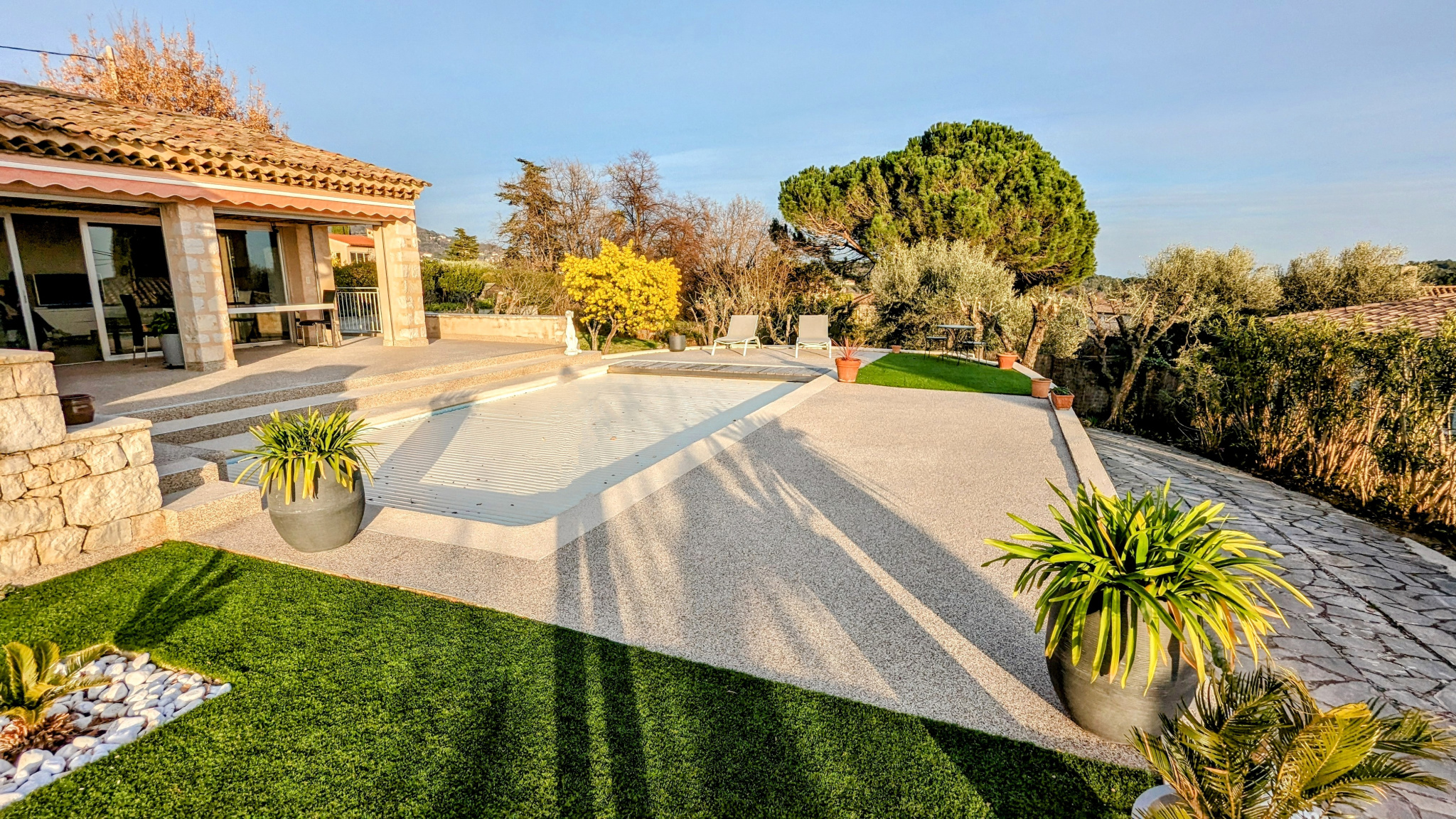 À l’extérieur, un vaste terrain de 1534 m2 accueille une piscine ensoleillée, entourée d’un jardin paysager soigneusement entretenu, créant ainsi un cadre idyllique pour se détendre et profiter du climat méditerranéen.