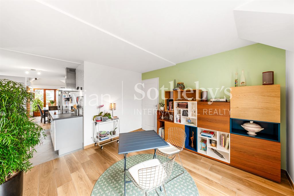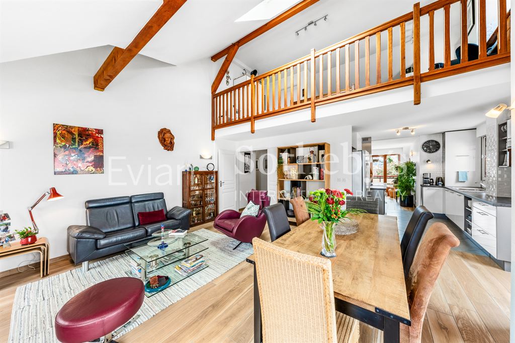 EVIAN SOTHEBY’S INTERNATIONAL REALTY vous propose : Amphion les bains, au calme : rare Appartement en duplex en dernier étage d’une résidence “pieds dans l’eau” avec un accès direct au lac depuis le parc privé de la résidence. Appartement de type 5 en duplex et vue sur le lac, comprenant au premier niveau : une entrée, une cuisine équipée semi-ouverte, un salon, une chambre, une salle d’eau et un WC. une salle de jeux ou chambre. Au second : 2 chambres, un bureau (mezzanine ouverte), une salle de bains et un WC. Le bien dispose également d’un box garage.