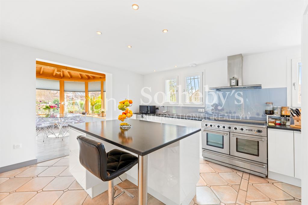 Au rez-de-jardin, vous trouverez une entrée, un WC, une grande penderie, ainsi qu’une cuisine entièrement équipée de qualité ouverte sur un salon lumineux grâce à son exposition plein sud, avec poêle. Une salle à manger en véranda et un cellier/buanderie complètent ce niveau.