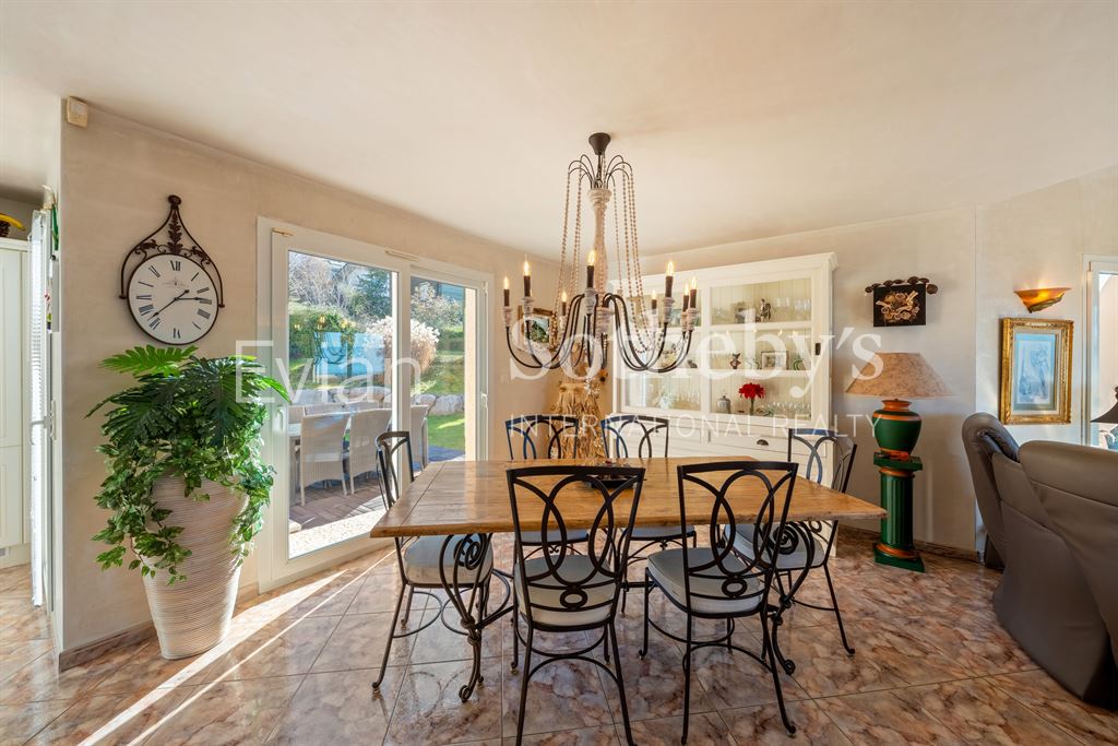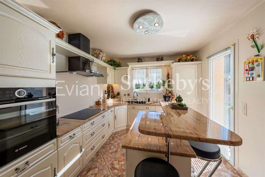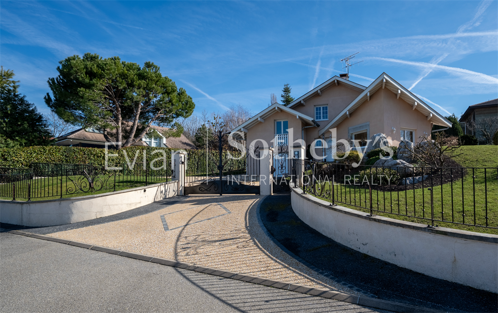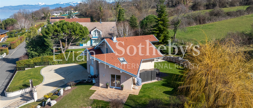 Sur la commune de Publier, au calme dans un quartier résidentiel, élégante villa d’une surface habitable de 171 m2 sur 1017 m2 de terrain avec une très belle vue sur le lac Léman. Comprenant : entrée avec placards, cuisine équipée ouverte sur salle à manger et séjour avec cheminée, accès terrasse au sud et sur une seconde terrasse à l’ouest. En 1/2 niveau une chambre (sud), une salle de bains avec baignoire d’angle et wc, une chambre vue lac. 1/2 niveau supplémentaire : 1 chambre au sud avec placards, 1 salle d’eau douche et wc, une chambre au sud avec placards. Sous sol : Garage, buanderie. 1/2 niveau inférieur : Un local rangement et une pièce vide sanitaire. Annexes : nombreux rangements extérieurs, portail d’entrée avec vidéophone. Très beau jardin paysagé.
