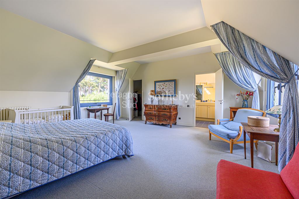 Sur un terrain de 5 000 m², cette maison lumineuse de 380 m² habitables offre de superbes volumes : un séjour-salon-cheminée de 100 m² ouvert sur la mer, une cuisine conviviale, une bibliothèque pour se poser. Cinq chambres dont deux vastes suites avec dressing et salle de bains, et une suite indépendante dans la maison d’amis avec terrasse vue mer. Un total de 6 chambres et 5 salles de bains.