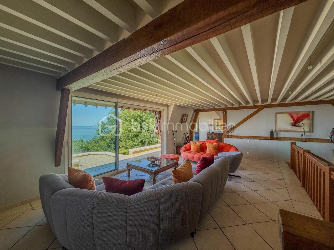 Derrière son portail discret, cette propriété dévoile une vue mer spectaculaire dès les premiers pas. Un emplacement rare, une demeure unique, pour amateurs de biens d’exception. La maison principale développe 285 m² habitables, implantée sur une parcelle paysagée de 1,9 hectare, incluant une forêt privative en contrebas, véritable cocon de verdure offrant calme et intimité absolue. Sa distribution atypique sur deux niveaux met en scène les espaces de réception à l’étage, entièrement tournés vers la mer. La lumière naturelle baigne les volumes grâce aux baies vitrées qui encadrent le panorama, comme un tableau vivant. Le salon principal, spacieux et chaleureux, est doté d’une cheminée et s’ouvre directement sur la terrasse face à l’océan. La cuisine aménagée et équipée, dispose également d’un espace dinatoire avec accès extérieur. Sur ce même niveau, vous trouverez un bureau, ainsi qu’un second salon plus intimiste, idéal pour un moment de lecture ou de détente. À l’étage supérieur, l’espace nuit propose deux chambres avec une salle d’eau indépendante, parfaites pour des enfants ou des invités de passage. En rez-de-jardin, la grande suite parentale bénéficie d’un accès direct au jardin, accompagnée de deux autres chambres, d’une salle de bain, une salle d’eau, wc indépendant et d’un espace détente à aménager selon vos envies. Annexes et prestations complémentaires : Pour recevoir famille et amis en toute indépendance, un appartement de 58 m² complète la propriété : une belle pièce de vie, deux chambres, une salle de bain et des toilettes séparées. Un triple garage fermé ravira les amateurs de belles voitures ou les collectionneurs. Cette annonce référence 294626 vous est présentée par votre agent commercial BSK Immobilier FANNY SCHUTZ (EIRL) immatriculé au RSAC de LISIEUX (14100) sous le numéro 82470116300027. Prix du bien : 1 649 000,00 € Les honoraires d’agence sont à la charge du vendeur. A propos des performances énergétiques : Date de réalisation du diagnostic énergétique : 16/07/2025 Score DPE : 242 kWhEP/m²/an Score GES : 7 kgepCO2/m²/an Montant estimé des dépenses annuelles d’énergie pour un usage standard : entre 4570.00 € et 6250.00 € par an. Prix moyens des énergies indexés sur l’année 2023 (abonnements compris). Les informations sur les risques auxquels ce bien est exposé sont disponibles sur le site Géorisques : www.georisques.gouv.fr