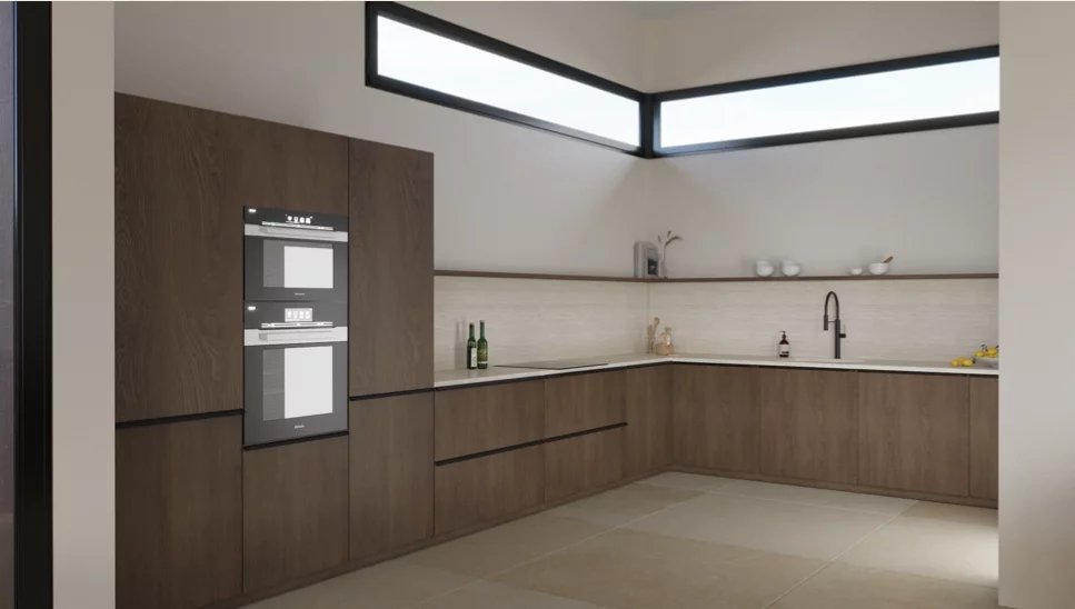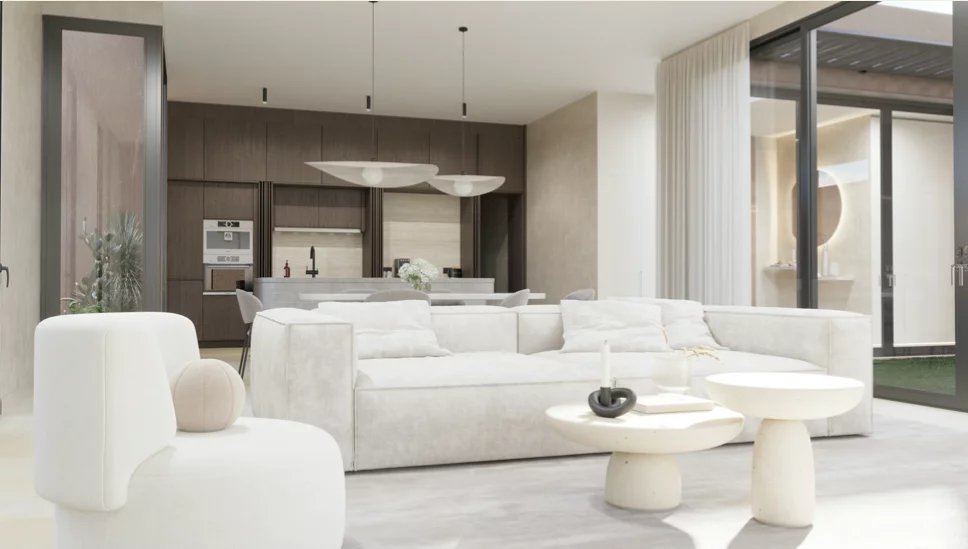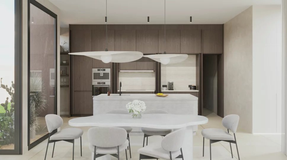 La cuisine est livrée équipée (BOSCH ou équivalent) — four, plaques induction, hotte — et les menuiseries intégrées mêlent finitions noyer et teintes naturelles pour une ambiance chaleureuse et intemporelle.