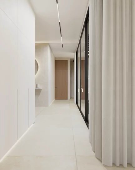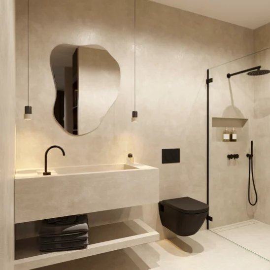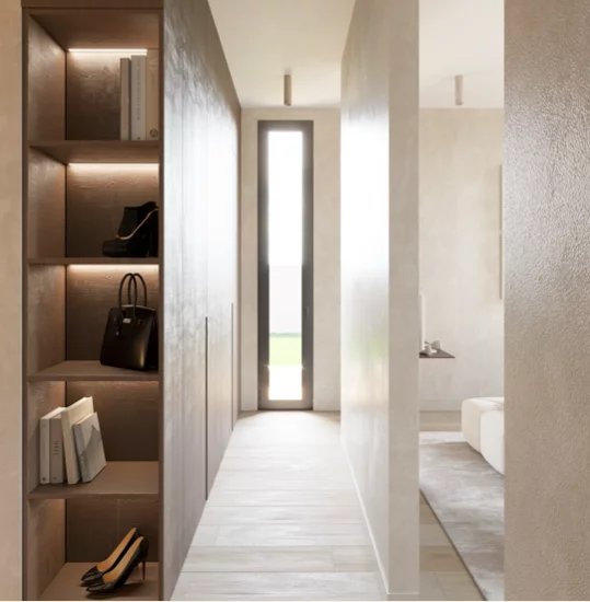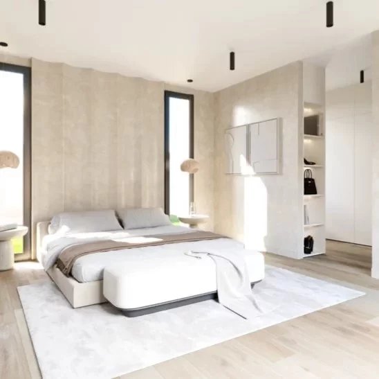 Le confort se vit au quotidien : menuiseries aluminium noir RAL 9005 et double vitrage de sécurité pour de grandes baies performantes, isolation renforcée (murs R≈3,15, plafonds R≈5–7,5), climatisation gainable réversible multi-zone pilotée par domotique (écran tactile et smartphone), et pré-équipement solaire en toiture pour maîtriser ses consommations.