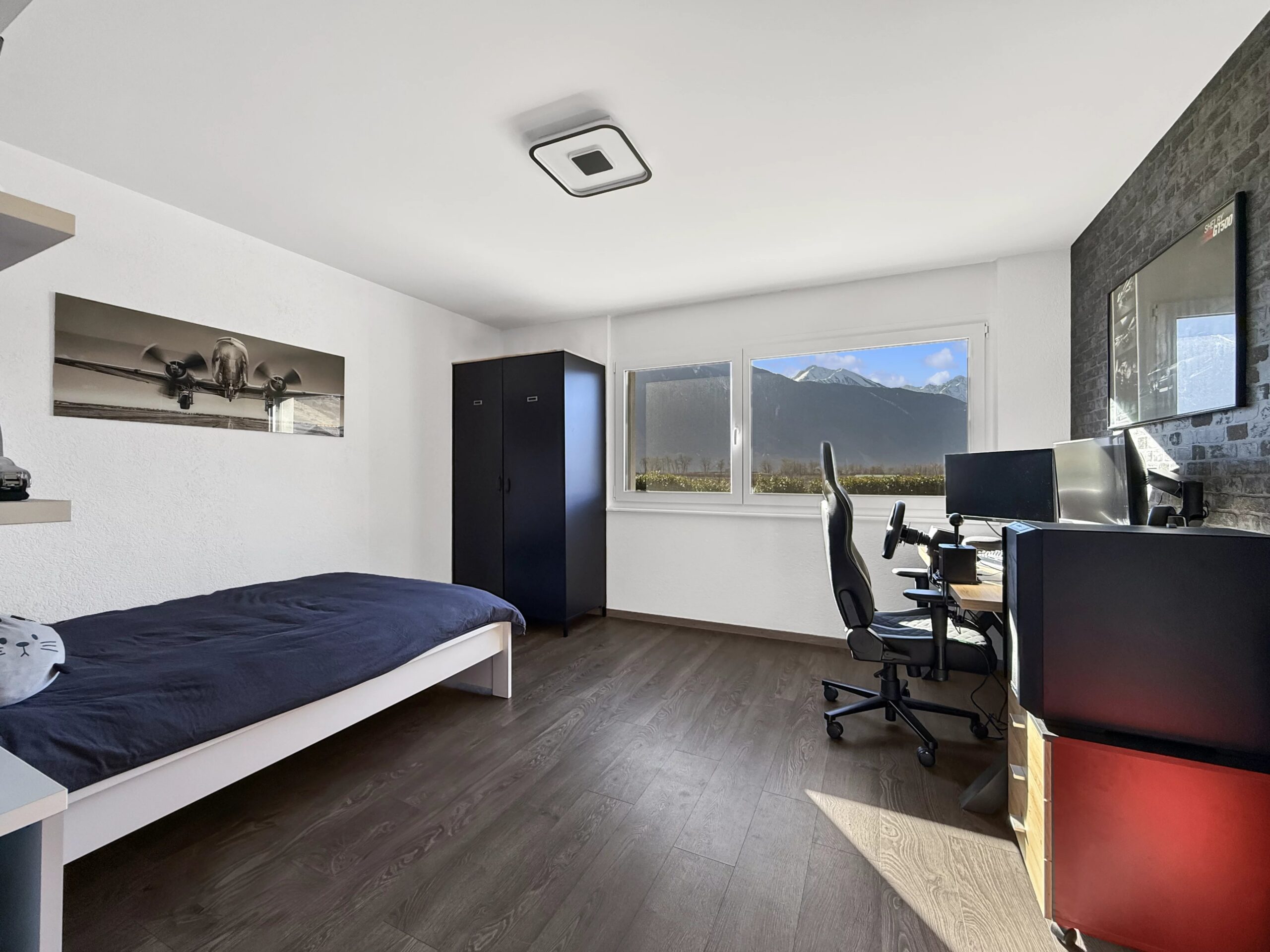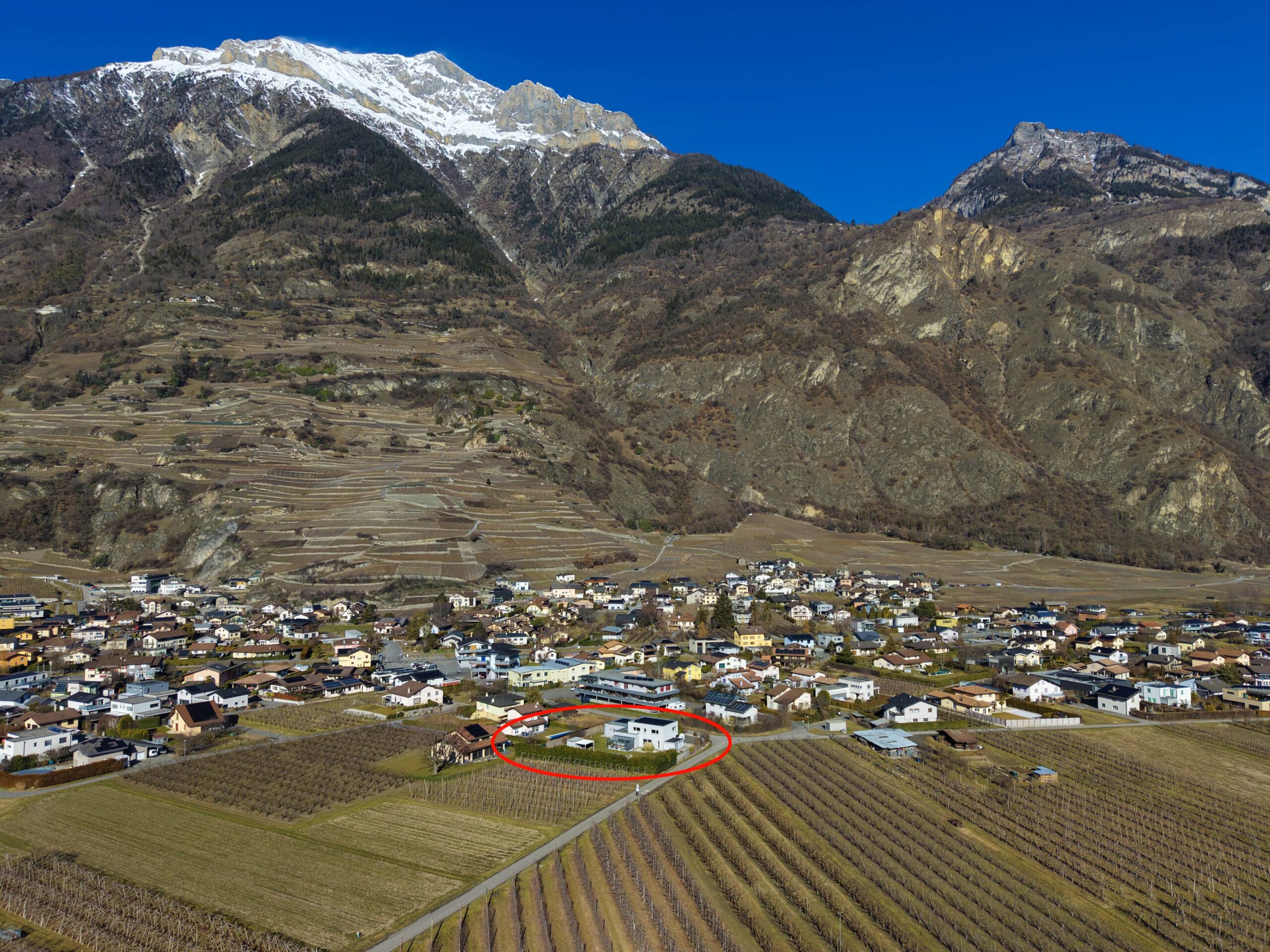 Vue splendide et dégagée pour cette villa contemporaine de 207 m2 et 1’111 m3 en bordure de zone agricole, construite en 2011 et située à Fully, en Valais, à proximité de toutes les commodités.
