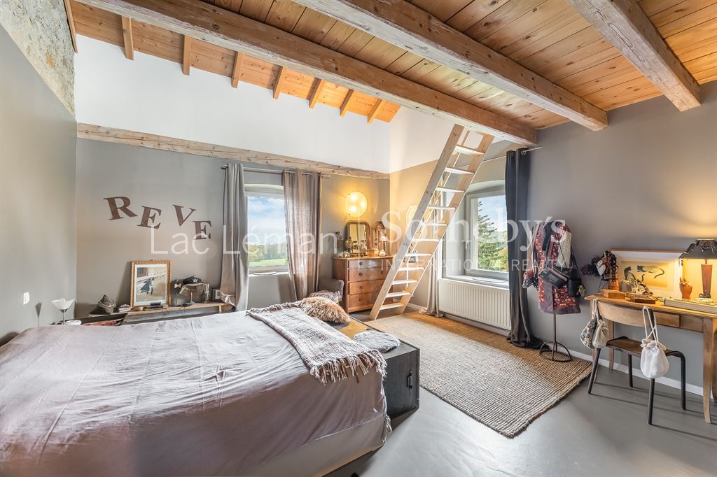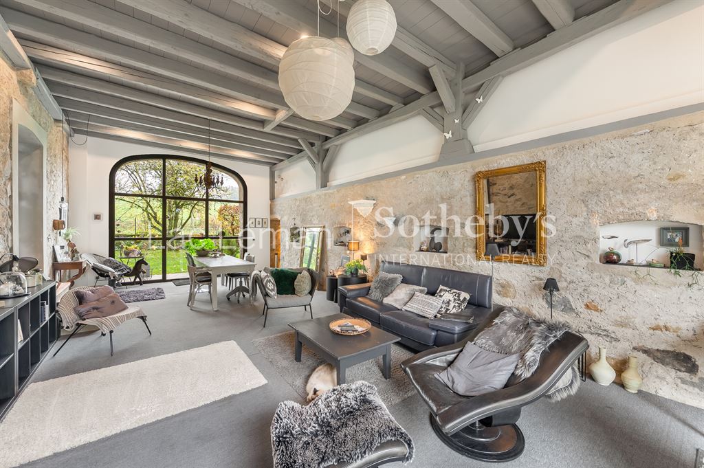 LAC LEMAN SOTHEBY’S INTERNATIONAL REALTY vous propose : Au cœur d’un environnement champêtre et préservé, un de corps de ferme datant de 1900 et rénovée avec élégance. Situé à proximité immédiate de la frontière suisse, ce bien conjugue charme authentique et confort contemporain. Développant 239 m² habitables, il offre une pièce de vie généreuse et lumineuse, sublimée par les pierres et poutres apparentes qui confèrent à l’ensemble un caractère chaleureux. La partie nuit propose trois chambres, dont une avec mezzanine, accompagnées d’une salle de bains et de deux salles de douche. En option, il est également possible d’acquérir une aile attenante d’environ 139 m² de surfaces brutes, permettant d’envisager différents projets d’aménagement : extension de l’espace principal, création d’un volume indépendant ou aménagements annexes selon les besoins. Cette propriété rare, alliant cachet, luminosité et potentiel d’évolution, séduira les amateurs d’authenticité et de belles perspectives de valorisation. LAC LÉMAN SOTHEBY’S INTERNATIONAL REALTY, votre expert de référence pour la vente de propriétés de prestige sur les rives du Léman et ses environs.