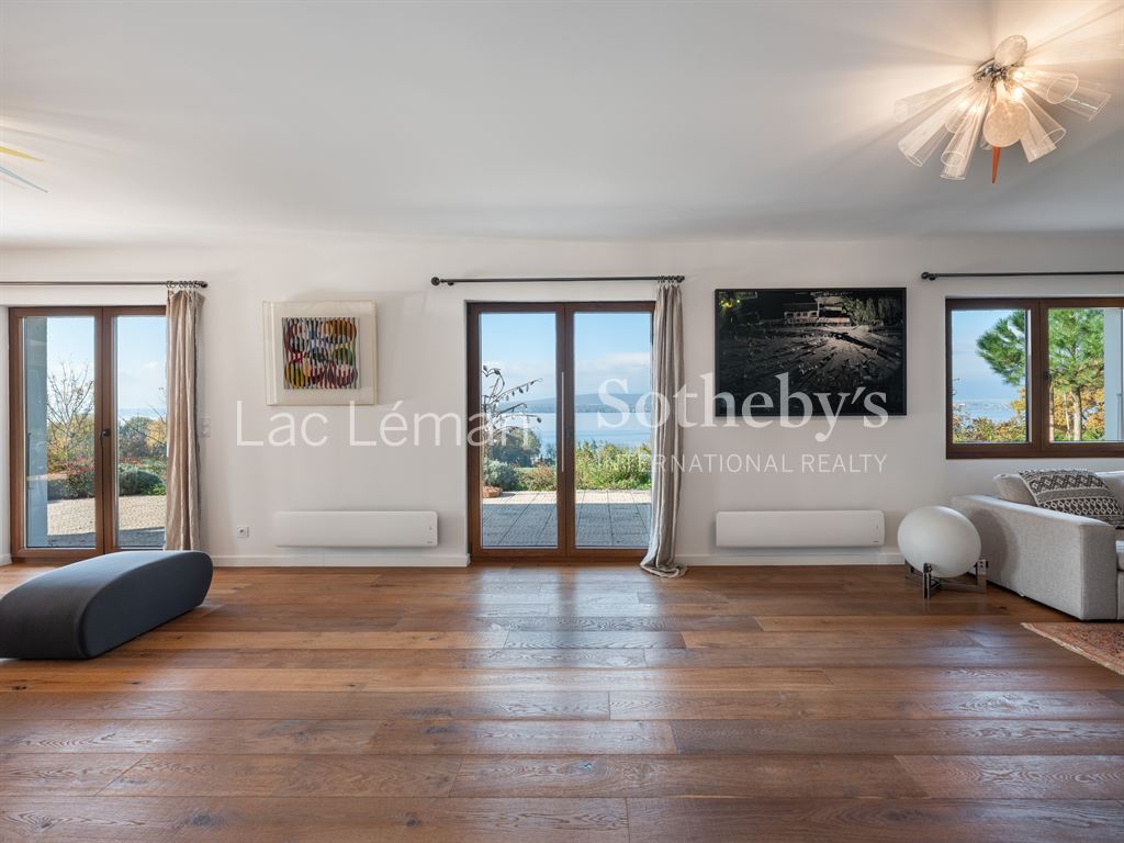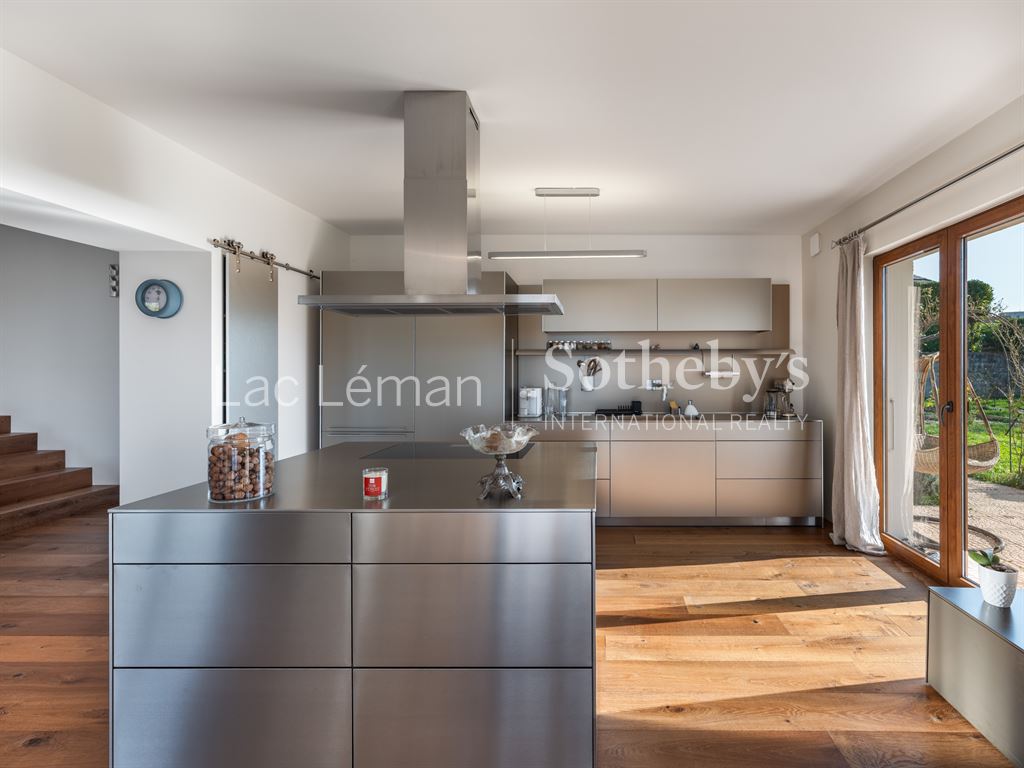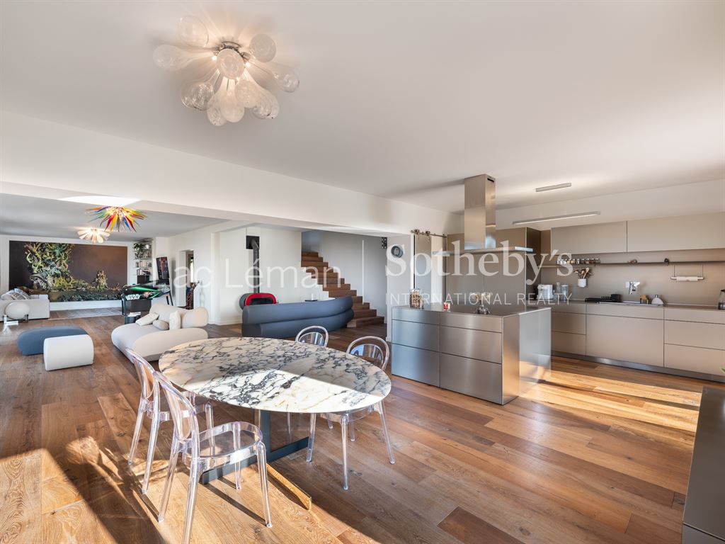 L’espace de réception est entièrement ouvert sur une terrasse offrant une vue imprenable sur le lac Léman et le Jura, sans aucun vis-à-vis. La cuisine, contemporaine et discrète, donne également accès à une terrasse.