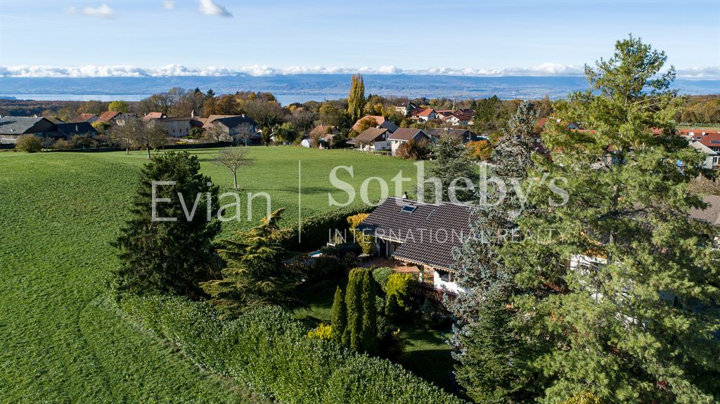 EVIAN SOTHEBY’S INTERNATIONAL REALTY vous propose à la vente cette spacieuse villa située à Féternes, dans un environnement paisible et verdoyant, sans vis à vis, à seulement 10 minutes d’Évian-les-Bains et de Thonon-les-Bains.