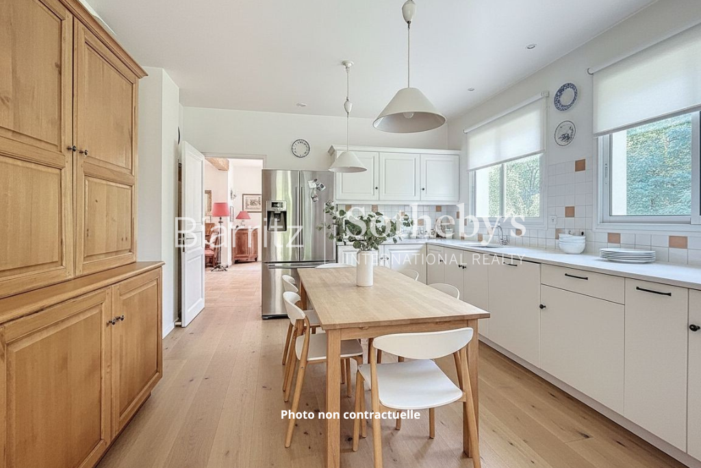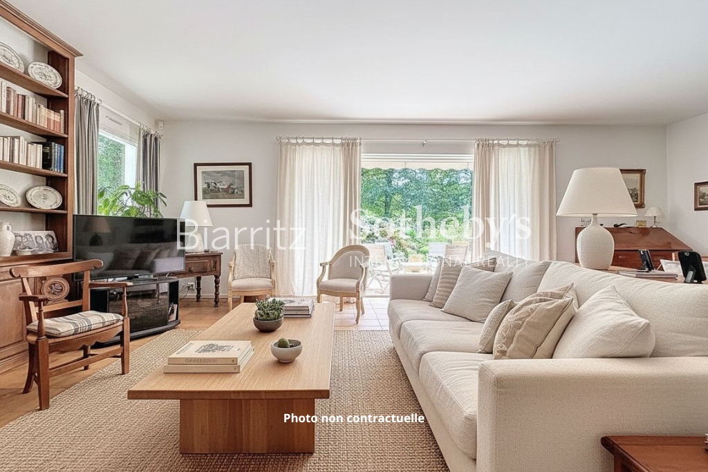 Située au calme absolu à Arcangues, à proximité de la forêt, cette villa d’exception séduit par sa luminosité, ses grands espaces et son orientation plein sud, offrant un cadre de vie privilégié sans aucune perte de surface. Imaginée par l’architecte Pierre Couteau, elle développe un superbe séjour lumineux de 64 m² ouvrant sur une terrasse de 60 m², avec une vue panoramique sur le golf d’Arcangues. Une élégante cuisine dinatoire de 18,5 m² complète cet espace de vie convivial et baigné de lumière. La maison propose cinq chambres, dont une suite indépendante en rez-de-chaussée avec dressings, idéale pour recevoir ou préserver l’intimité. À l’étage, deux salles d’eau supplémentaires assurent un confort optimal pour toute la famille. Un vaste sous-sol de 106 m², comprenant garage et cave, vient parfaire l’ensemble en offrant de généreux espaces de rangement. Quelques travaux de rafraîchissement permettront de révéler tout le potentiel de cette propriété et d’en sublimer les prestations, constituant également un levier intéressant dans la négociation. À proximité immédiate de Biarritz, cette propriété rare sur le marché incarne un art de vivre privilégié, entre océan, environnement verdoyant et architecture néo-basque de qualité.
