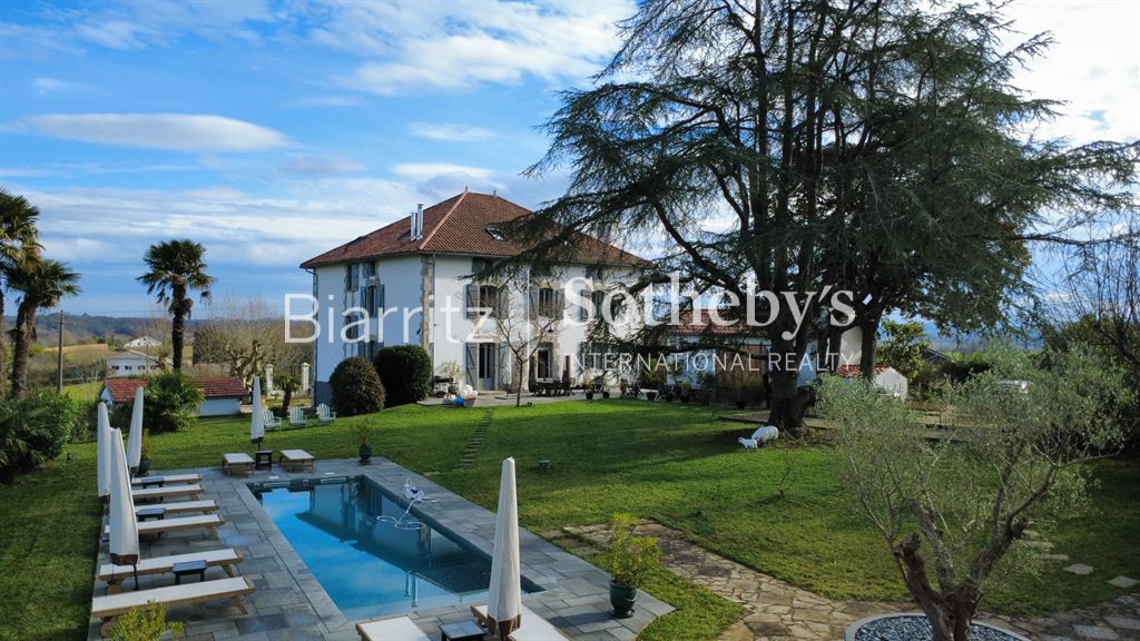 Implantée sur un terrain paysager de 4 200 m² avec piscine chauffée, elle bénéficie de vues imprenables sur la campagne et les Pyrénées.