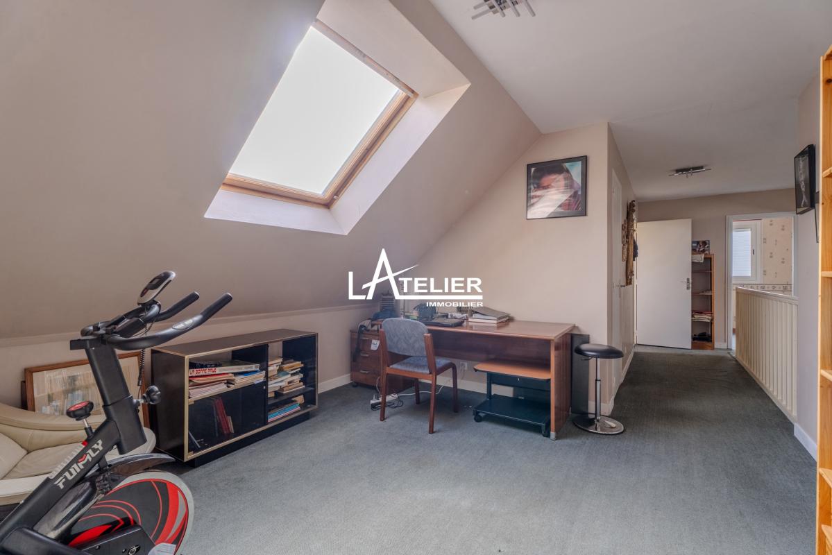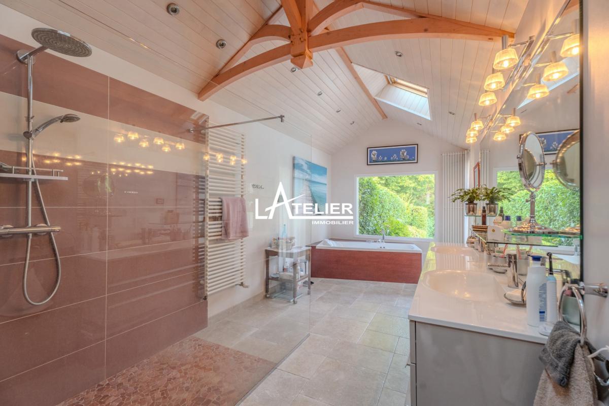 Sautron côté Cens – Potentiel et emplacement ! Lumineuse et au calme absolu à proximité des commerces et du bus, vous profitez d’une belle vue dégagée plein ouest sur l’environnement verdoyant en bordure de la vallée du Cens, 6ch, piscine, garage et cave, le tout au cœur de Sautron sans aucun vis-à-vis. Cette maison familiale par excellence dispose d’un salon-séjour de 70m² et d’une surface rare de plain pied. Des travaux d’actualisation sont à prévoir et nous tenons à votre disposition des partenaires pour les préciser en fonction de vos attentes. Cette maison atypique se distingue par son volume habitable généreux (230m²) avec 6 chambres + un bureau et son cadre de vie privilégié, idéal pour ceux en quête d’espace, de confort et de facilité au quotidien. L’atout majeur est un salon + un double séjour, grande pièce de vie de 70m2 avec de grandes baies vitrées tournées vers le jardin ; la cuisine séparée est aménagée et équipée ; la très spacieuse suite parentale offre un confort de vie de plain-pied, avec une salle de bain privative d’un volume exceptionnel, avec vue sur le jardin, ainsi qu’un grand dressing et une seconde pièce de rangement ; un bureau complète le rdc et permet d’accueillir facilement des invités et/ou de télétravailler. À l’étage, actuellement 5 chambres s’articulent autour d’un grand palier, espace bureau ou de jeux supplémentaire, une salle de douche, un atelier ainsi qu’un grenier. Ces volumes au potentiel certain sont à actualiser et vous mettrez à votre goût ces espaces. Une grande cave d’environ 25m² avec un accès indépendant est un plus certain où l’on peut imaginer un espace de loisir, un atelier ou un studio de musique. Un garage et des places de stationnement extérieur sont également disponibles. Une maison de jardin vient enrichir le potentiel de la propriété, où on peut installer un espace de travail ou de loisirs distinct. Le terrain arboré à l’abri des regards, constitue un cadre verdoyant et préservé que l’on admire de la terrasse exposée plein ouest sans aucun vis-à-vis, au bord de la piscine. Enfin, le DPE C est gage de confort et de performance. À deux pas du Cens, des commodités et des axes principaux, cette maison allie espace, fonctionnalité et potentiel dans un environnement paisible du bourg. Une opportunité à saisir sur le marché de Sautron.