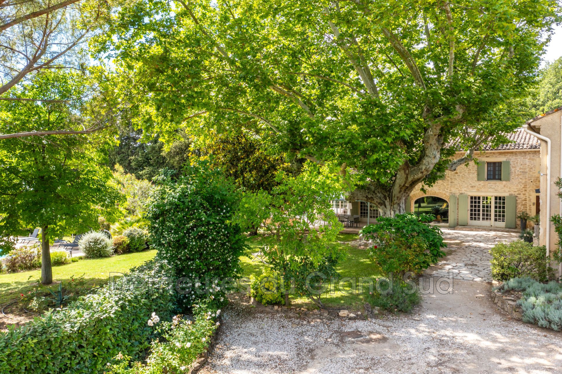 Au charme provençal, l’extérieur est parfaitement paysagé. Il est composé d’essences locales, d’une jolie fontaine au pied d’un somptueux platane tricentenaire. Le parc s’agrémente également d’une piscine sécurisée de 6×12 m avec plage protégée par un écrin de verdure, d’un terrain de pétanque, d’un potager et d’un petit bosquet.