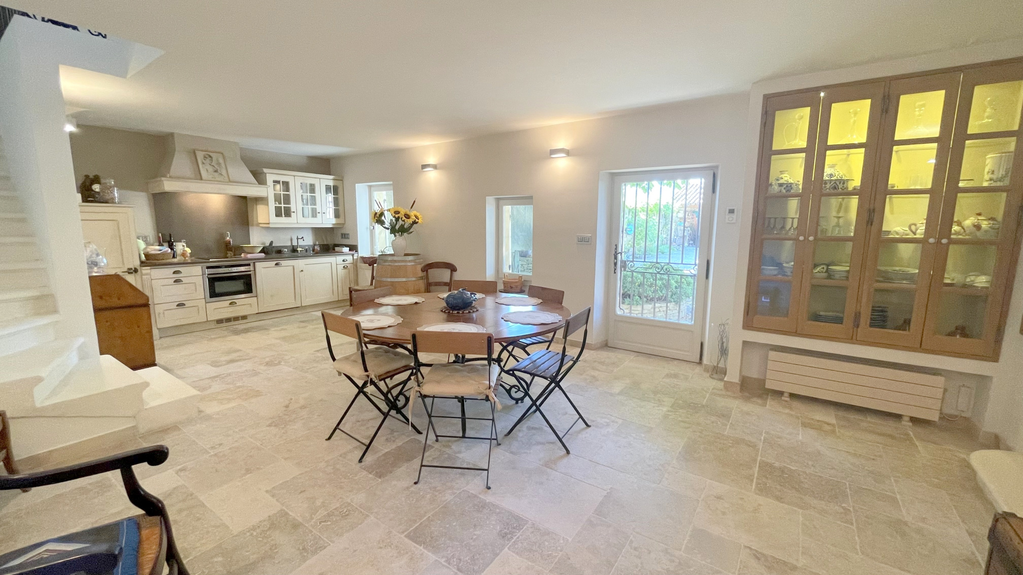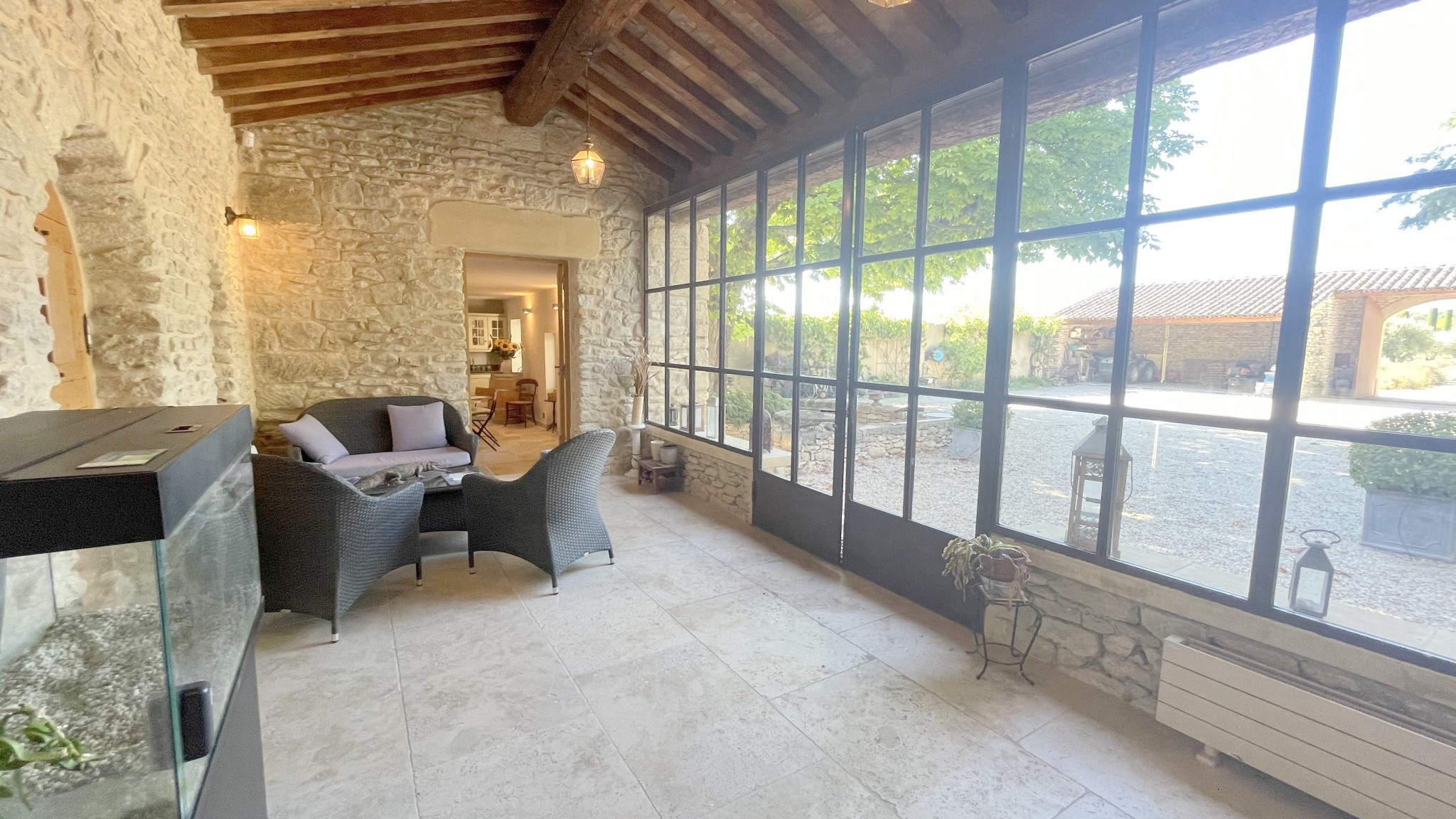 Dès l’ouverture du portail, la magie opère et vous laisse découvrir une superbe cour intérieure. Vous entrez dans ce mas plein de cachet et d’authenticité par une élégante verrière.