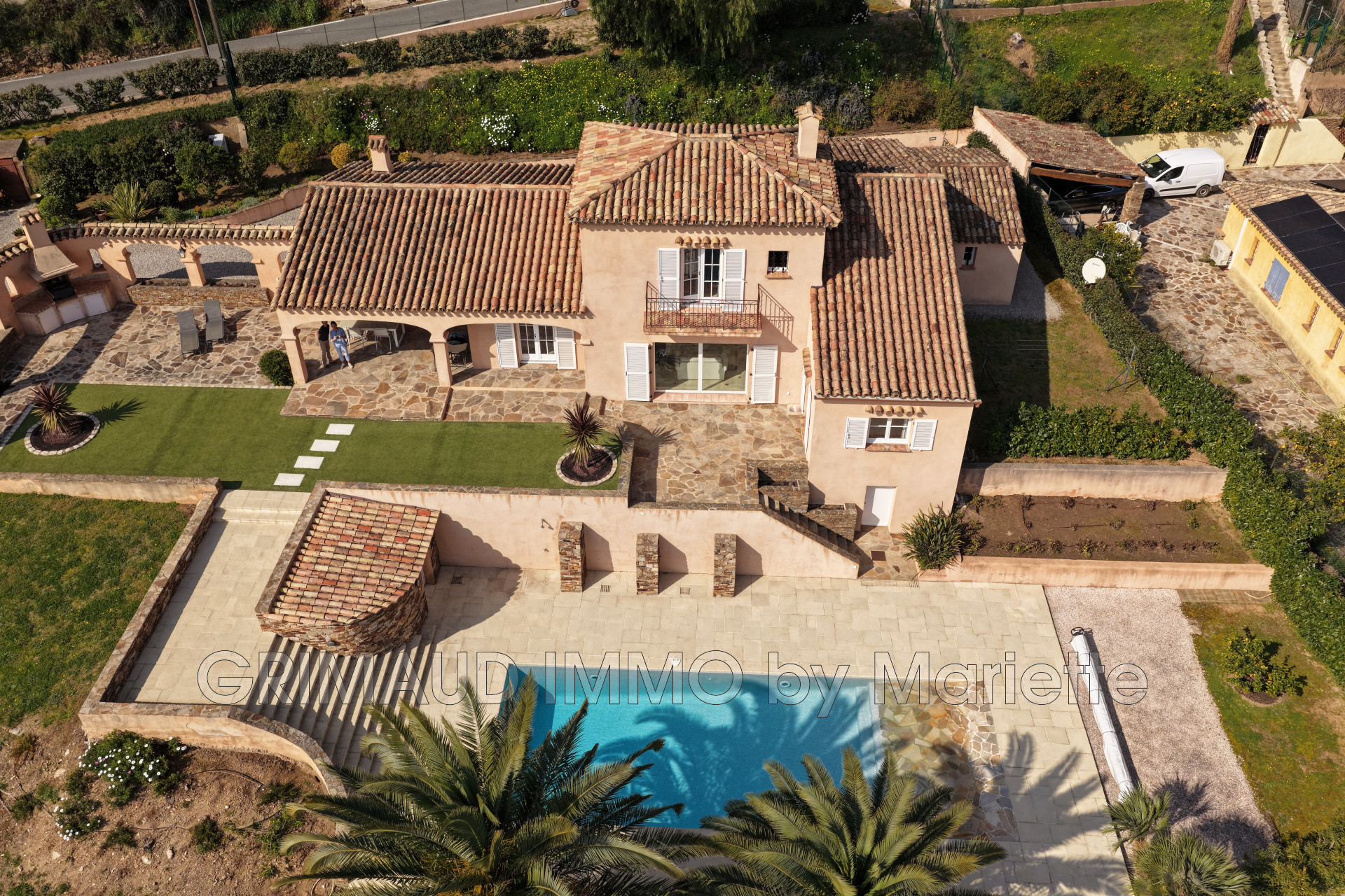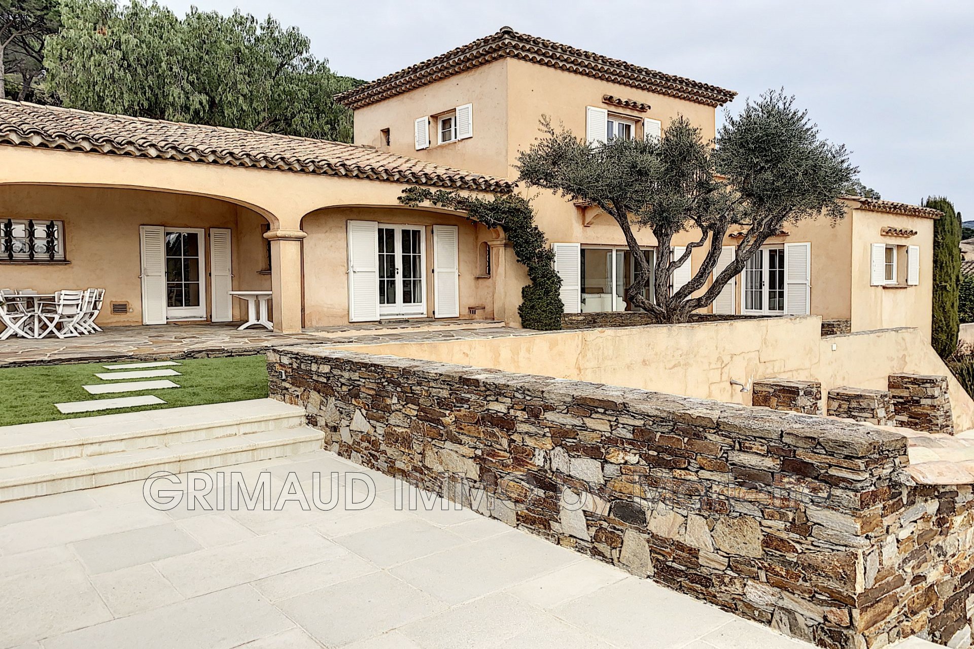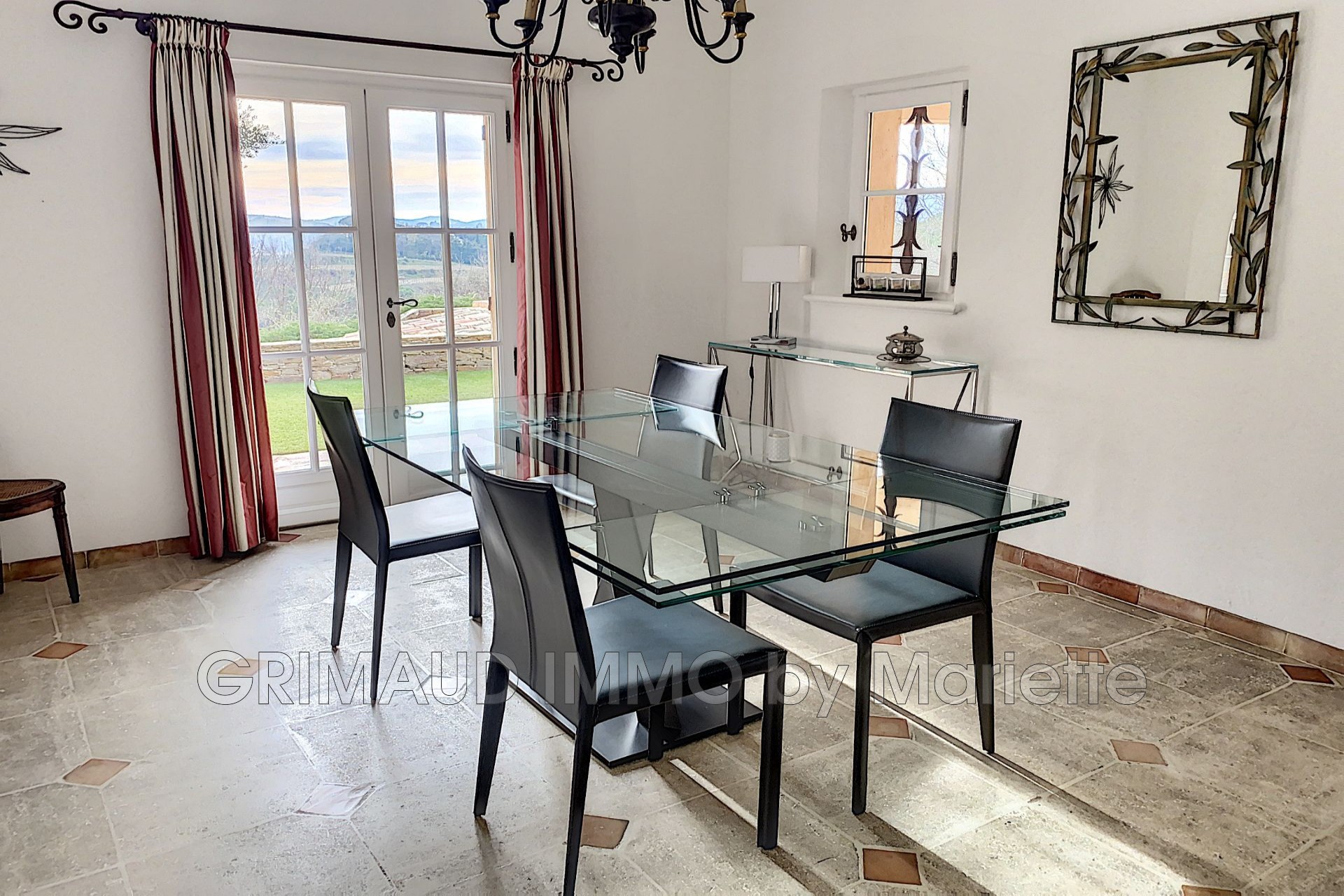Belle maison avec vue sur château de Grimaud, sur 3080m² de jardin clos se composant: hall, séjour avec salle à manger, cuisine indépendante équipée, buanderie, deux belles chambres avec 2 dressings, qui partagent une salle de bains, wc indépendant, à l’étage deux chambres, une salle de douches. Cave, atelier et belle piscine de 13m de longeur. La villa est à pied du village de GRIMAUD.