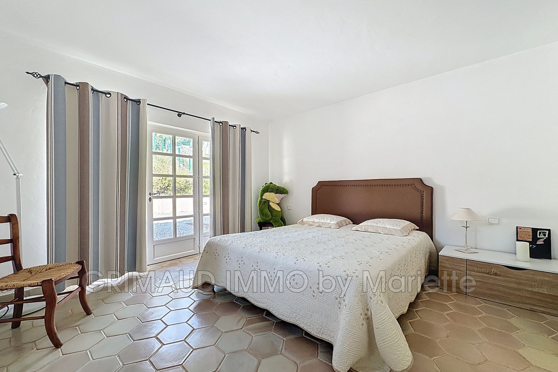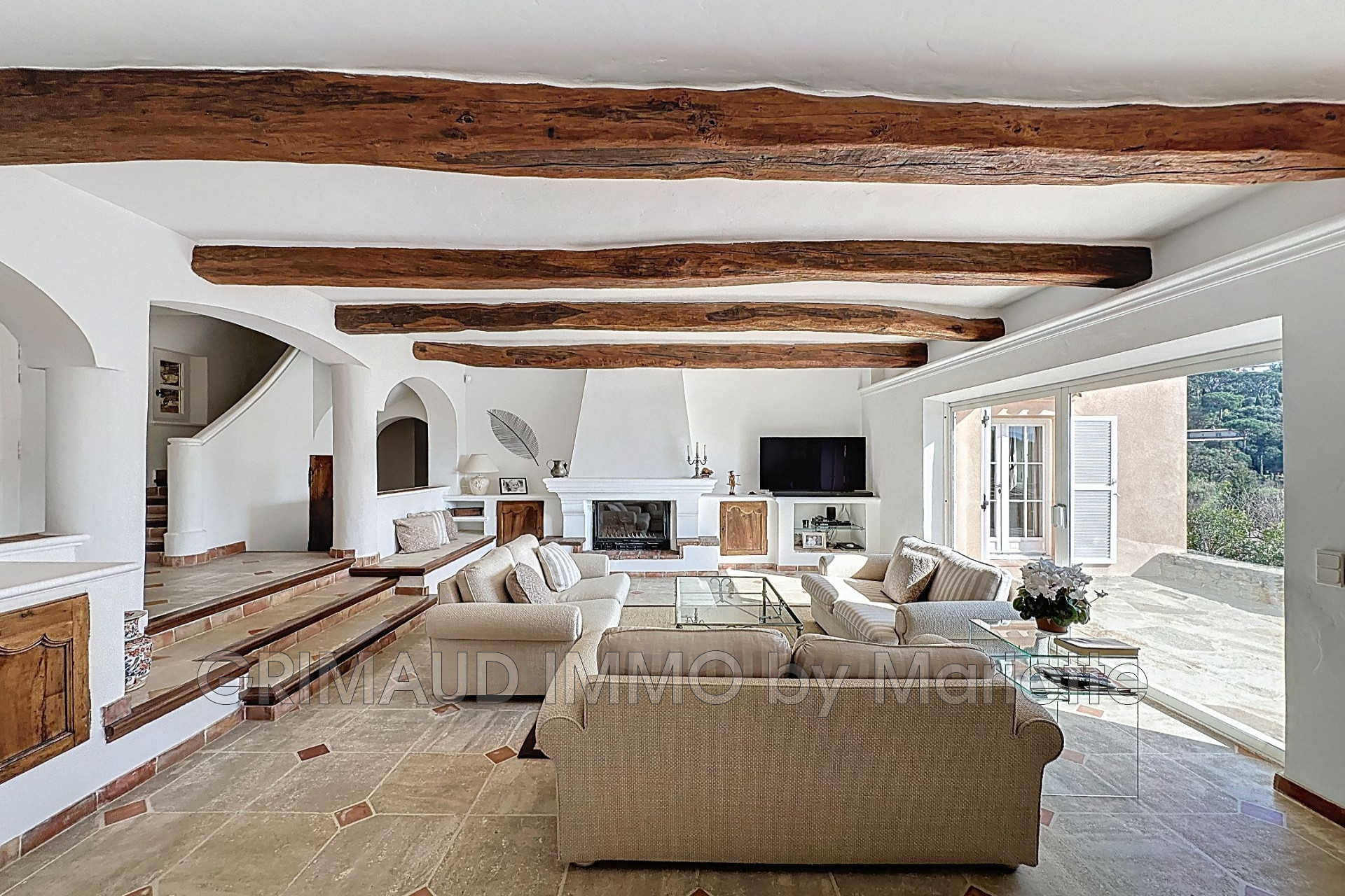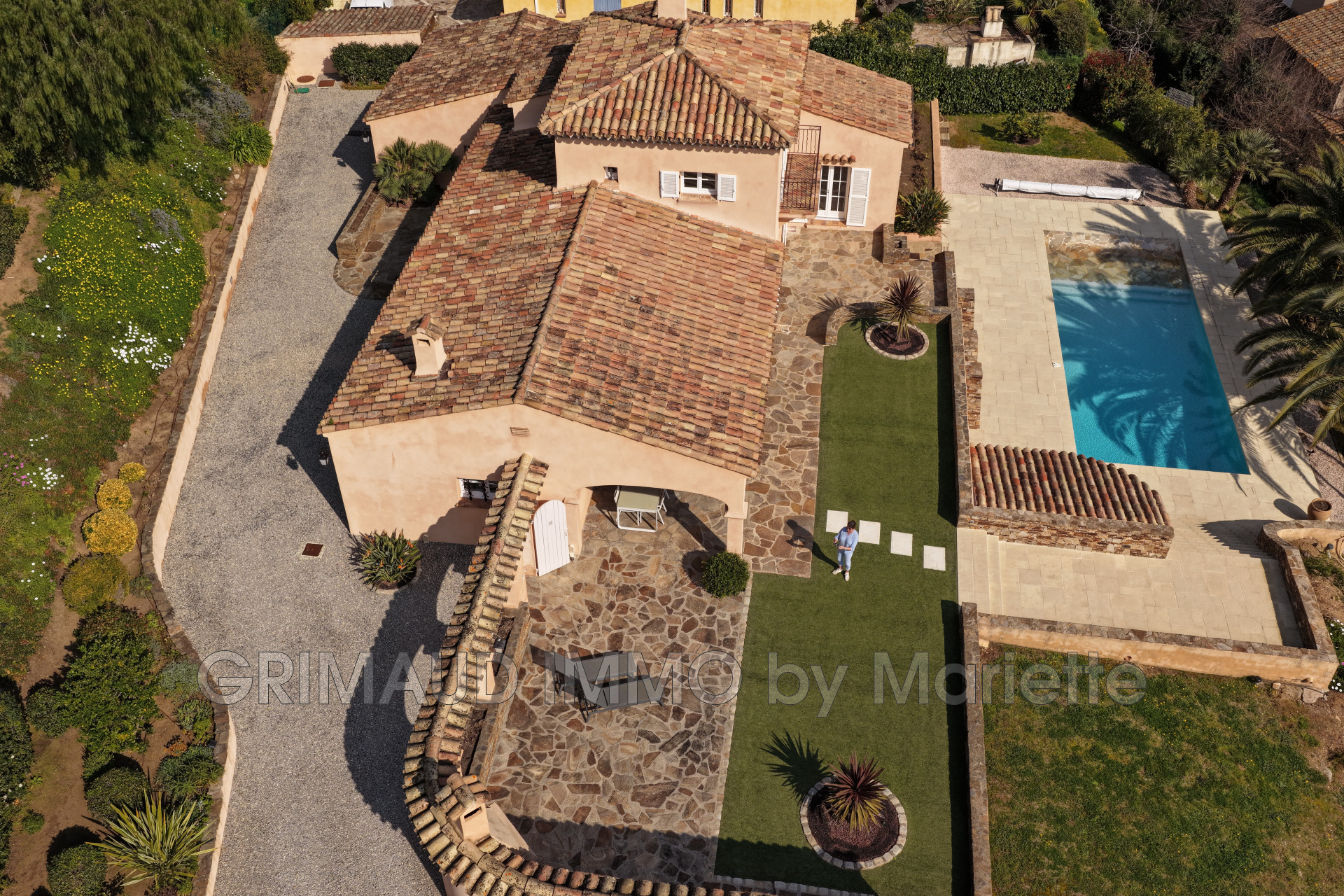 Belle maison avec vue sur château de Grimaud, sur 3080m² de jardin clos se composant: hall, séjour avec salle à manger, cuisine indépendante équipée, buanderie, deux belles chambres avec 2 dressings, qui partagent une salle de bains, wc indépendant, à l’étage deux chambres, une salle de douches. Cave, atelier et belle piscine de 13m de longeur. La villa est à pied du village de GRIMAUD.