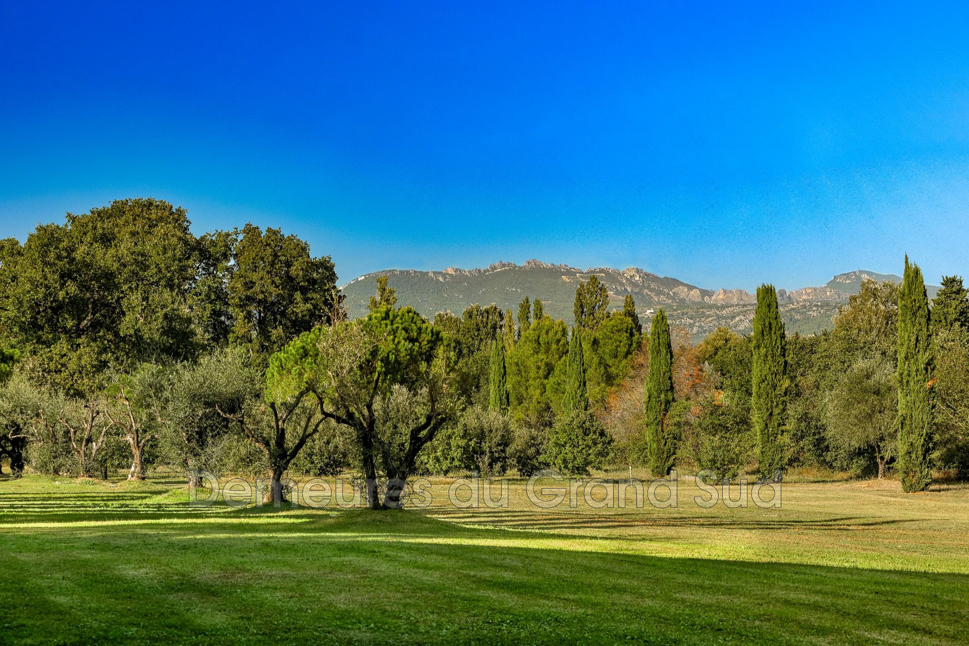 Authentique Mas d’environ 800 m² en position dégagée profitant d’une vue exceptionnelle sur les Dentelles de Montmirail et le Mont Ventoux au cœur d’un parc boisé et arboré d’environ 4,5 hectares composé de pins, de chênes, d’un verger et d’oliviers.