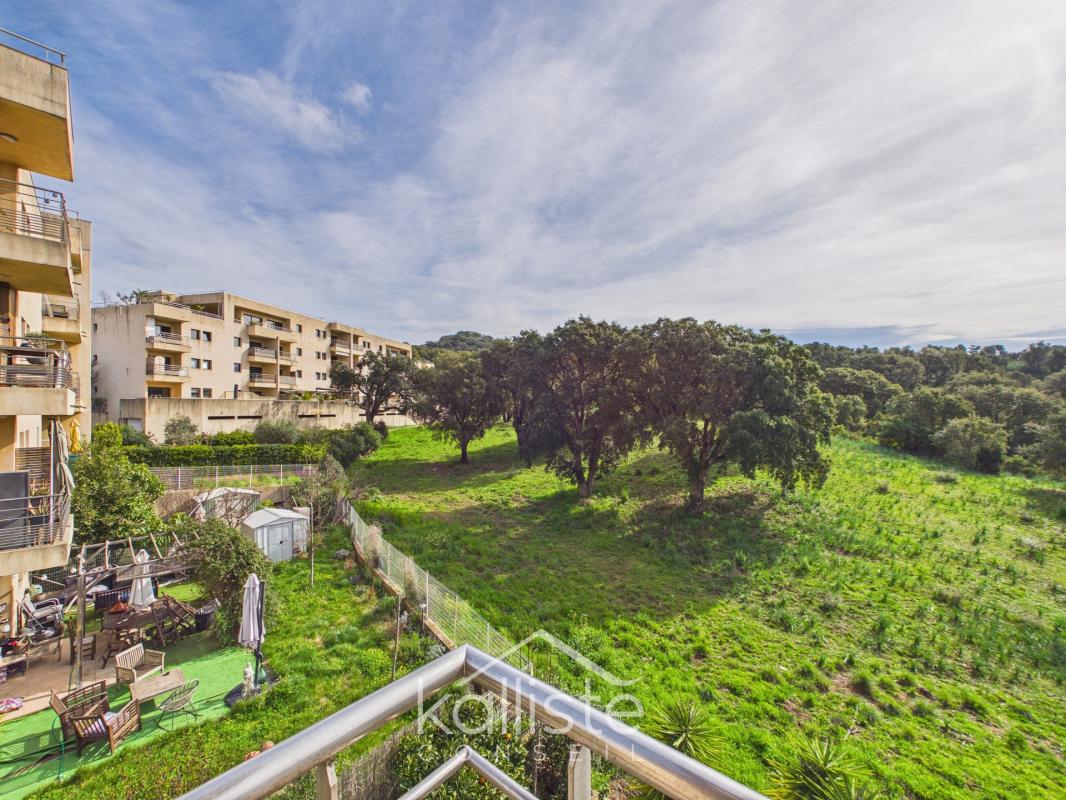 Grand T3 lumineux avec terrasse – Résidence A Spusata – Quartier Madunuccia – Ajaccio Kalliste Conseil vous propose en exclusivité ce grand appartement T3 situé dans la résidence A Spusata, dans le quartier recherché de la Madunuccia à Ajaccio, à proximité immédiate de la rocade. L’appartement se compose d’une entrée avec placard, d’un très vaste espace de vie lumineux comprenant séjour et cuisine aménagée en coin, offrant un volume rare et une excellente circulation. La partie nuit, bien séparée, dessert deux chambres confortables, une salle de douche, un WC indépendant ainsi qu’un cellier pratique pour le rangement. Atout majeur : un balcon-terrasse avec vue dégagée sur le parc arboré de la résidence. Environnement très vert, calme absolu et aucune nuisance sonore. L’immeuble, à taille humaine (deux étages seulement), offre une architecture particulière avec un accès à l’appartement par un escalier extérieur ouvert. Stationnement collectif sécurisé par barrière. Les + : – Aucun travaux à prévoir – Lumineux – Terrasse avec vue dégagée sur parc – Résidence calme et arborée – Accès rocade immédiat – Petit immeuble Un emplacement stratégique alliant tranquillité et mobilité rapide vers le centre-ville et les axes principaux.