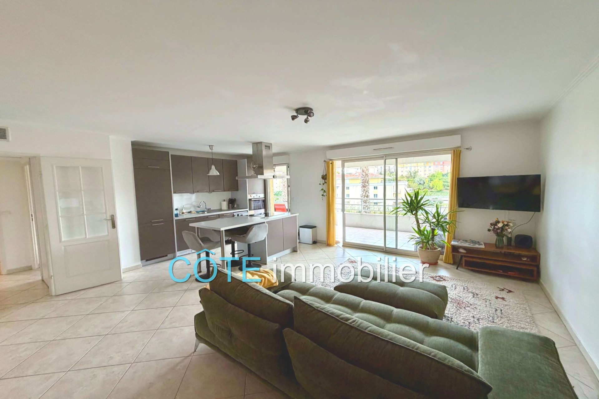 Séjour + cuisine équipée de 30m² donnant sur une généreuse terrasse orientée plein sud de 18m² offrant une belle vue dégagée sur le parc avec aperçu mer.