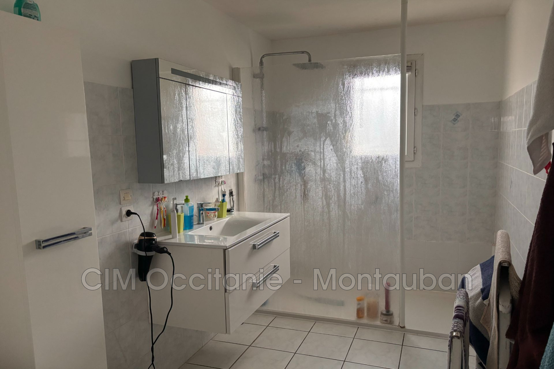 La salle de bain est équipée d’une douche à l’italienne et d’un sèche-serviettes. Une buanderie complète l’ensemble.
