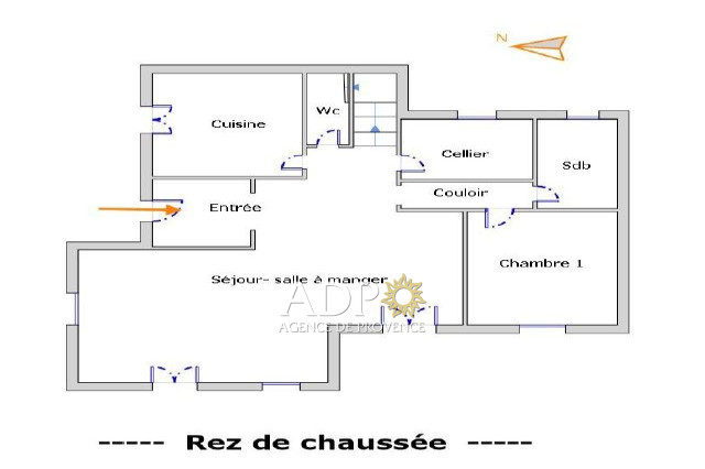 au RDJ : cuisine – séjour (de 48 m²) donne sur une terrasse avec jardin, une chambre, une salle de bains, un cellier, WC.
