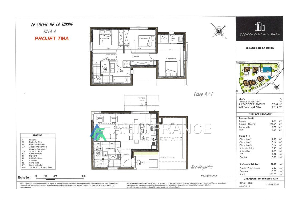 Charmante villa individuelle neuve de 87m², située dans le très recherché quartier Village à La Turbie, Sur deux niveaux et bénéficie d’une exposition Sud, laissant profiter d’une lumière naturelle abondante toute la journée. Elle est composée de trois chambres confortables, d’une salle de bain, d’une salle de douche, ainsi que d’un WC séparé. Vous apprécierez la cuisine américaine ouverte sur un séjour de 29m², donnant sur une terrasse privative avec vue sur le jardin. Son état intérieur neuf et ses prestations de qualité, notamment le double vitrage, sauront vous séduire. La maison comporte également deux emplacements de parking. Le terrain d’une superficie de 147m². Livraison fin 2024, frais de notaire réduits.