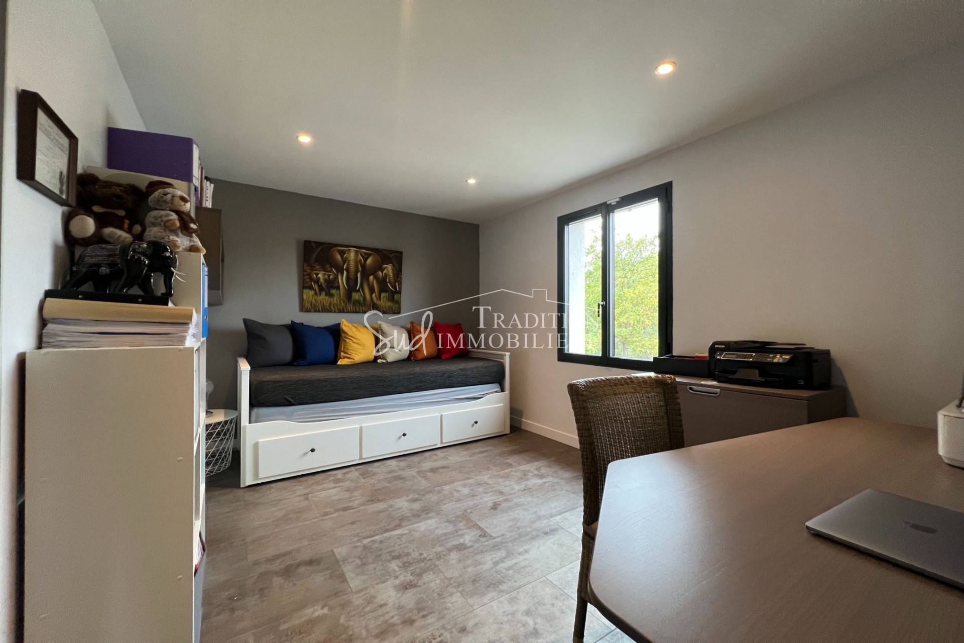 Située au calme et proche des commerces du Village de Maussane les Alpilles, cette jolie villa propose de lumineux espaces de vie avec une cuisine équipée de qualité. De belles terrasses organisent ses extérieurs. La maison bénéficie de quatre chambres dont une suite parentale au rez-de-chaussée avec salle de bain privative aux prestations haut de gamme et dressing aménagé. À l’étage, trois chambres et une salle de douche avec WC indépendant. Terrain de 440 m² environ, joliment paysagé, profitant de différents coins de détente ombragés et d’une piscine chauffée bénéficiant de fonction jacuzzi et nage à contre-courant. Garage avec mezzanine, parking.