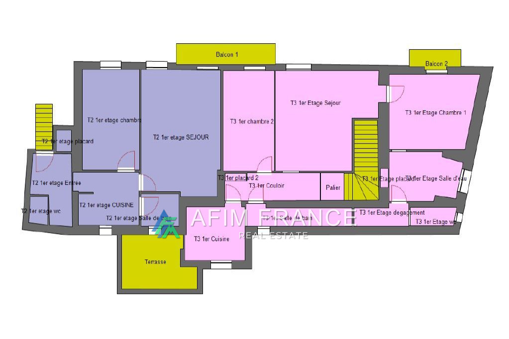 – Au 1er niveau, accessible chacun par 2 escaliers indépendants : un appartement de type 3 Pièces de 70 m² ouvert sur une belle terrasse de 8 m² côté Nord et deux balcons avec vue sur le jardin au Sud et un appartement de type 2 Pièces de 48 m² ouvert sur un balcon vue jardin.