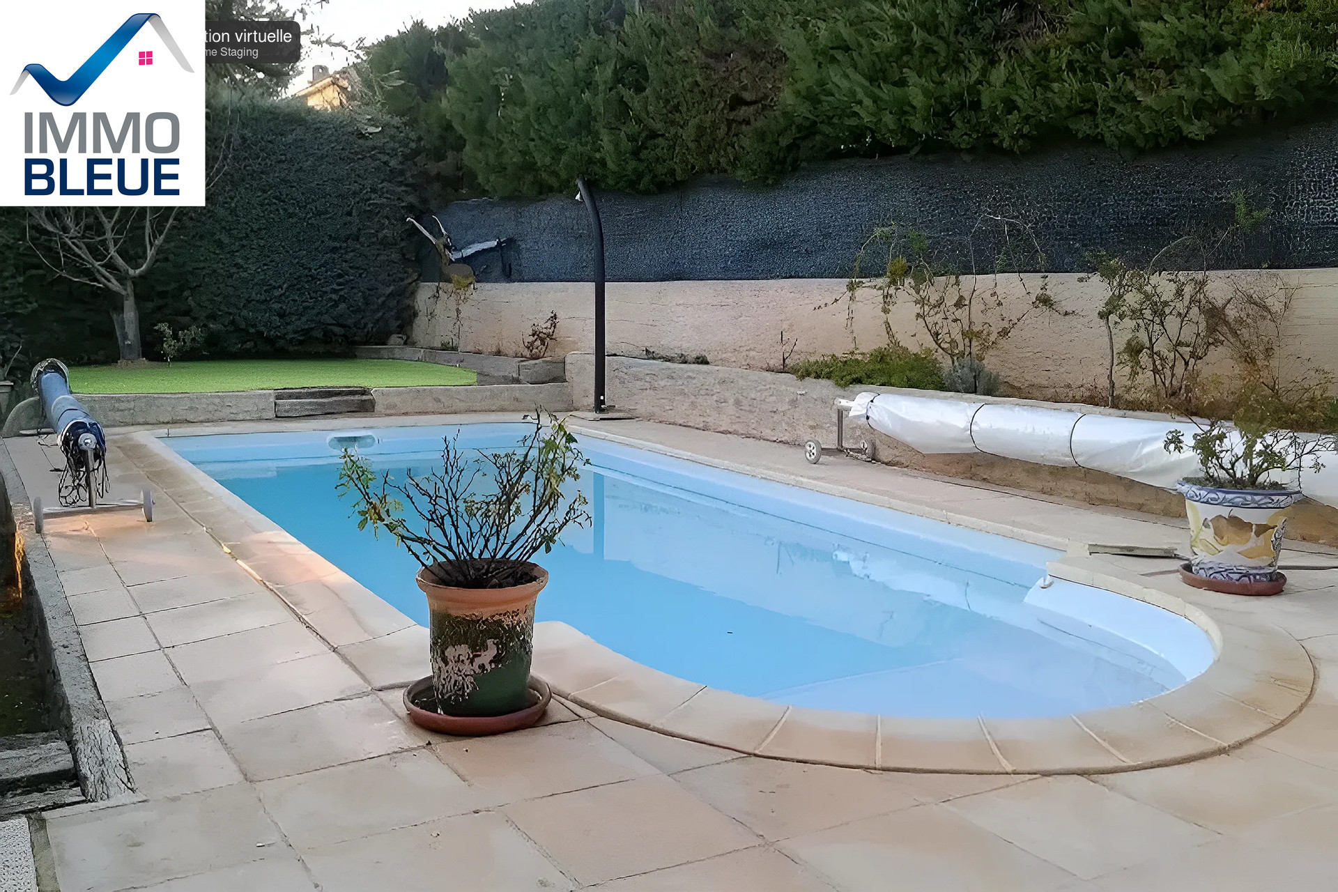 l’extérieur offre un joli jardin sans vis-à-vis avec piscine .