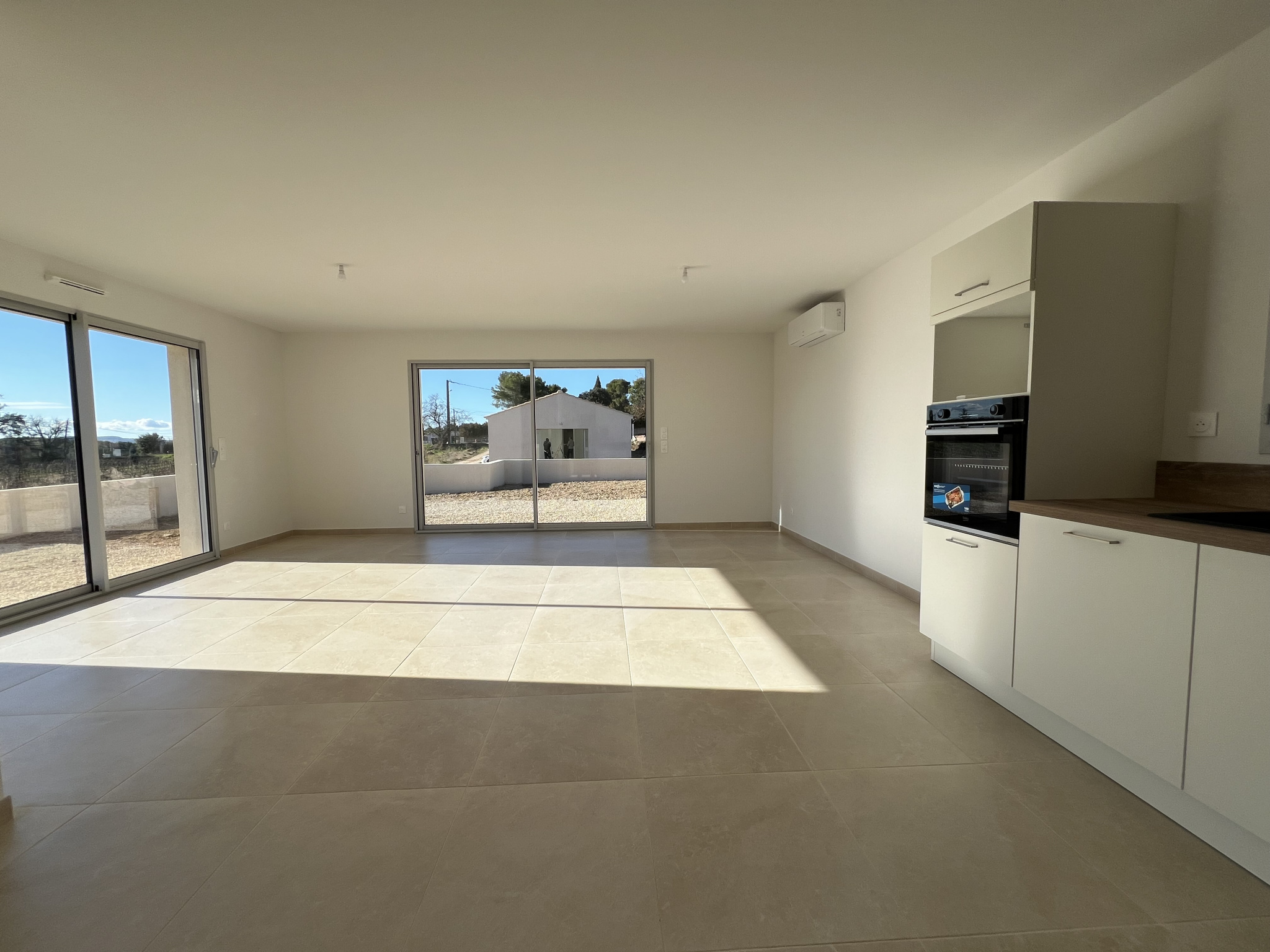 Grande pièce de vie climatisée avec sa cuisine ouverte équipée (plaque à induction, hotte, four, arrivée d’eau pour frigo américain), 2 baies vitrées en aluminium avec volets roulants motorisés en aluminium.