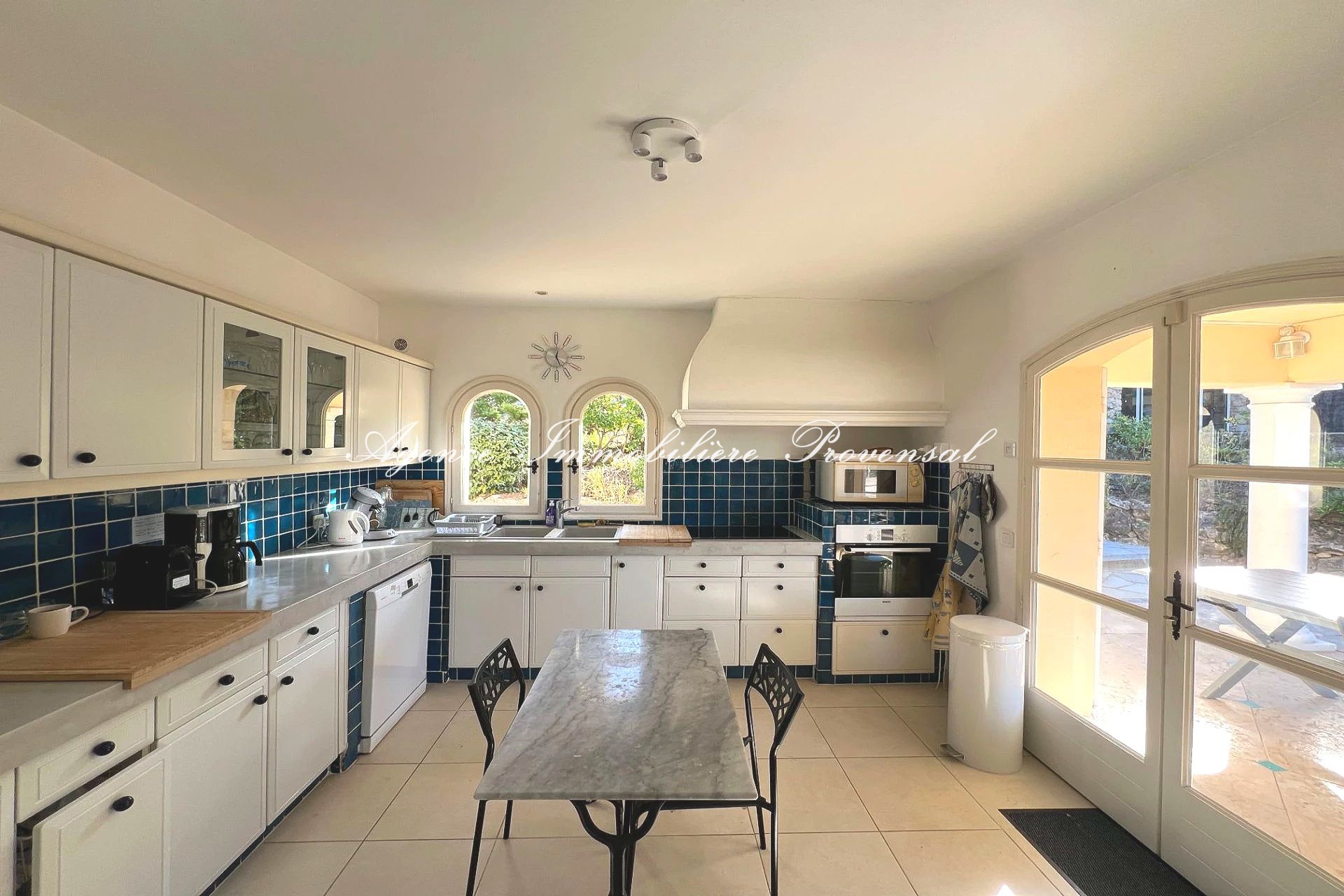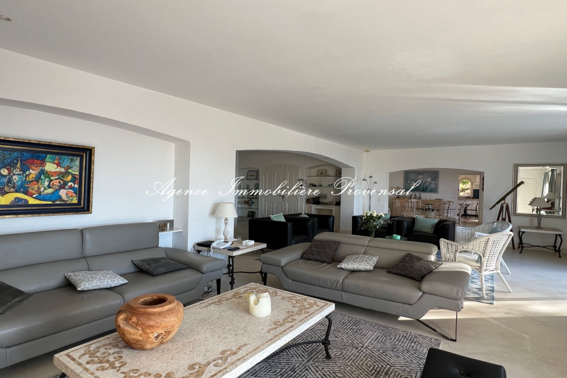 Espaces de vie : Séjour lumineux avec de grandes baies vitrées et accès direct à une terrasse aménagée, cuisine entièrement équipée avec accès sur une terrasse couverte et abritée, salle à manger intérieure et extérieure pour des repas conviviaux avec vue sur la mer