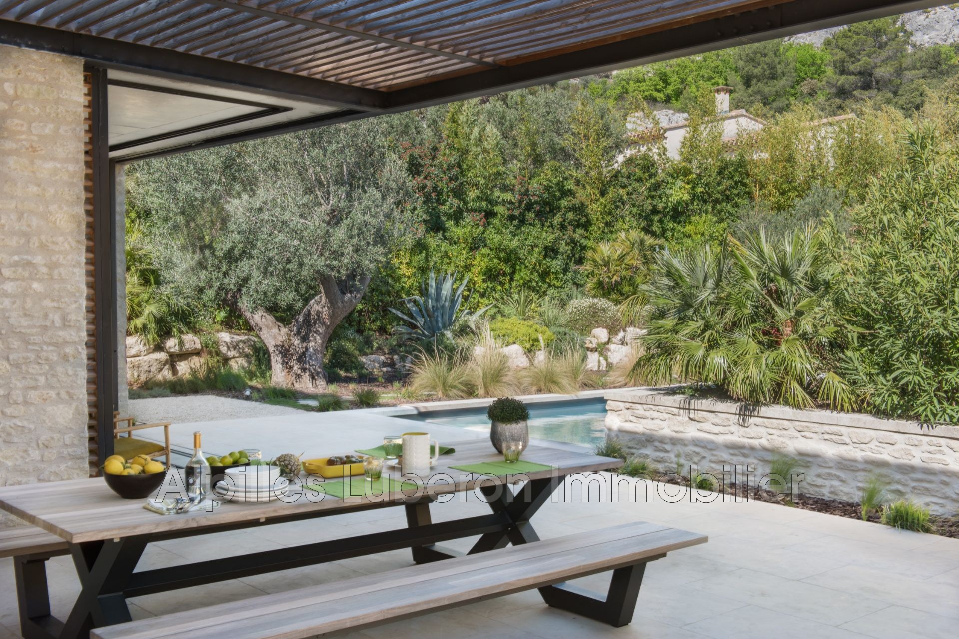 Cette maison, située à quelques pas du coeur d’Eygalières, combine élégamment une architecture épurée, un ameublement contemporain de grande qualité et la luxuriance de la végétation méditerranéenne et tropicale.