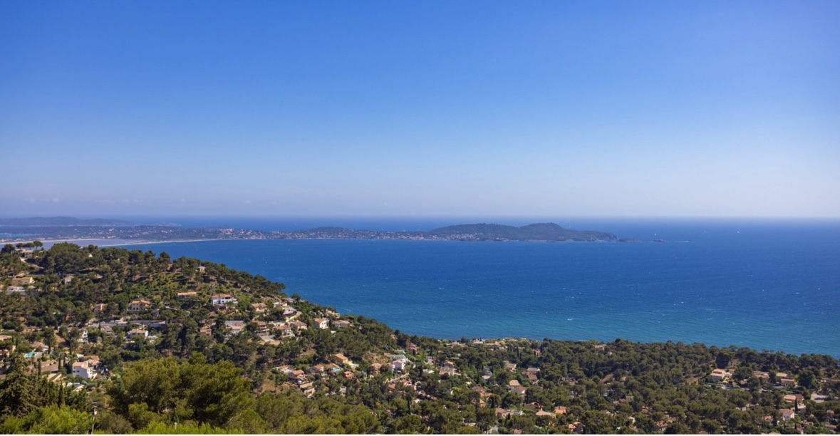 Vers l’est vous pourrez admirer les Iles d’or (Porquerolles, Port Cros) ainsi que le double tombolo de la presqu’île de Giens et ses marais salants.