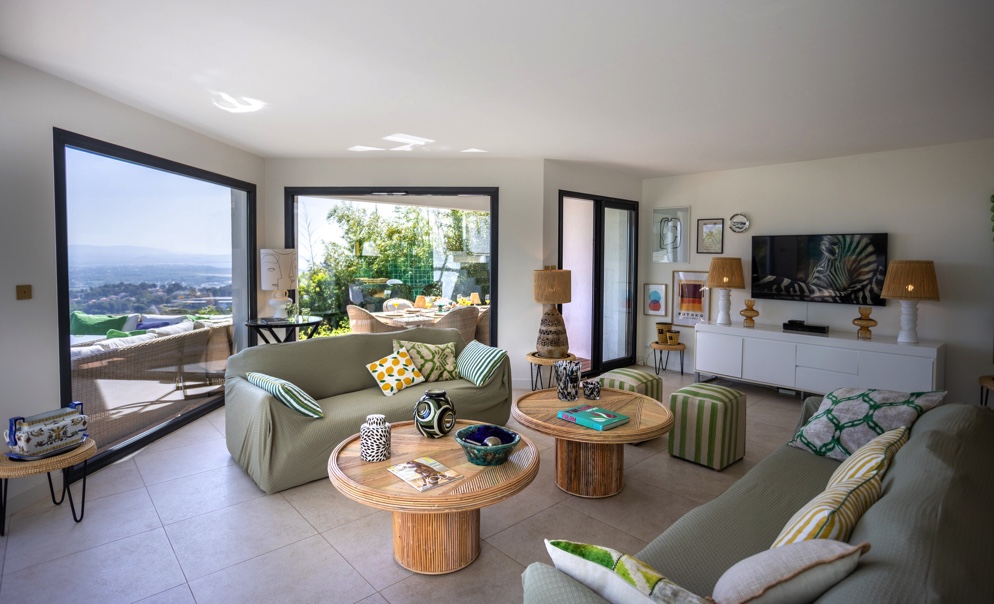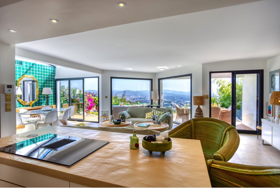 Donnant sur la terrasse extérieure et la piscine vous apprécierez la luminosité de la pièce de vie composé d’une cuisine ouverte et salon/salon à manger.