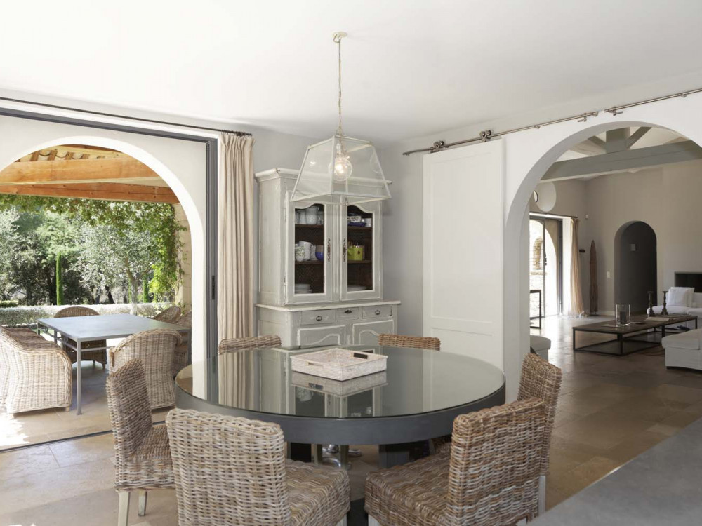 La cuisine donne sur une salle à manger extérieure, à côté de laquelle se trouvent des terrasses meublées avec des canapés de bon goût et une pergola couverte de vignes.
