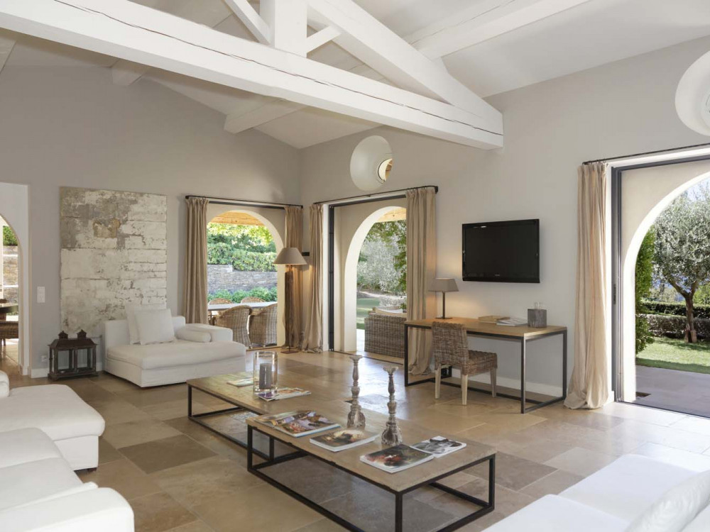 Les intérieurs de bon goût sont revêtus de carrelage, de poutres apparentes blanches et d’un mobilier moderne. Le salon spacieux bénéficie d’une grande cheminée à foyer ouvert et de belles doubles portes donnant sur une terrasse ensoleillée. Chaque chambre donne sur le jardin et la piscine.
